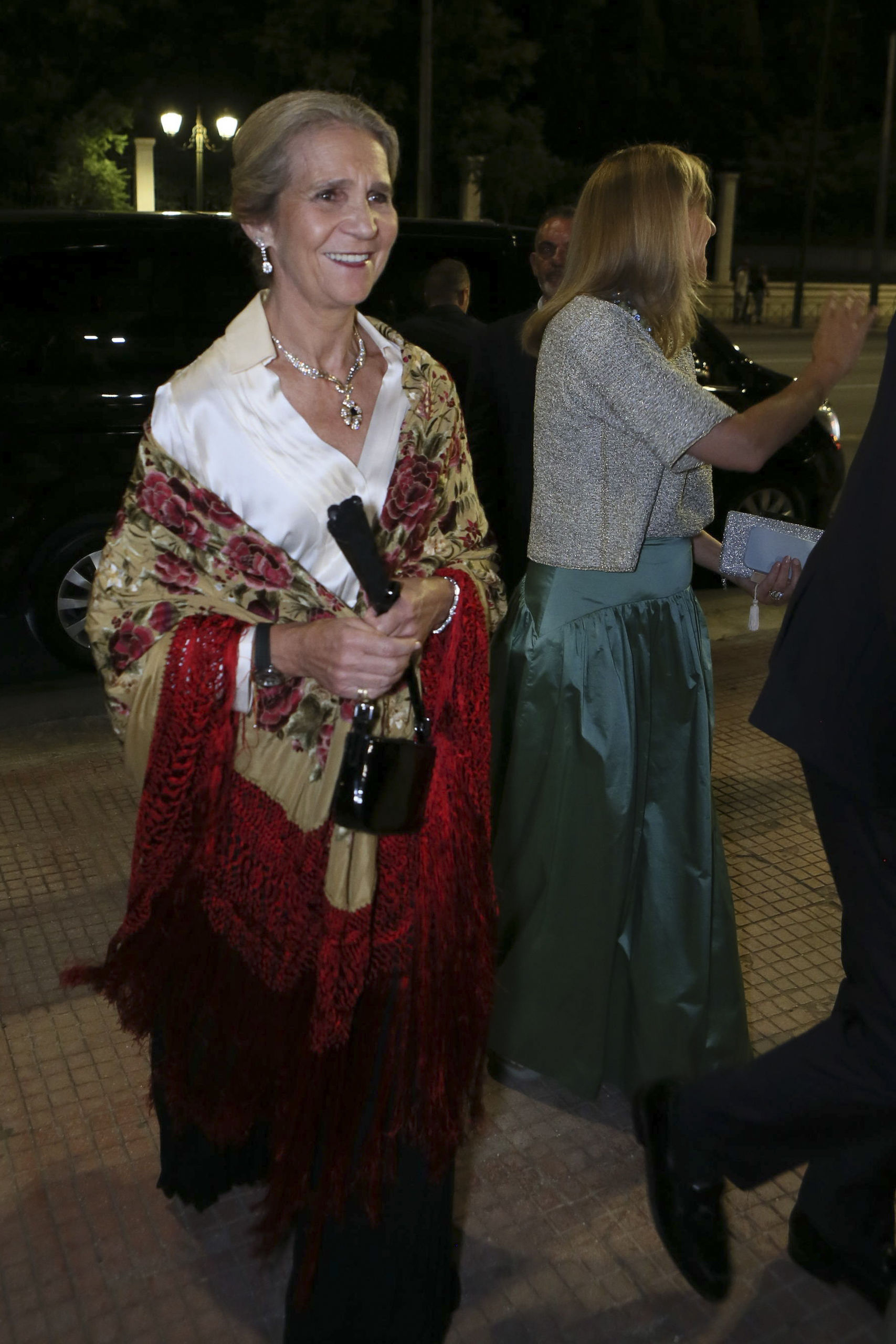 La infanta Elena y su hermana la infanta Cristina han mostrado su mejor cara durante la recepción, evitando mostrar reacciones a la publicación de las controvertidas imágenes de su padre. A destacar el precioso mantón que lució doña Elena.