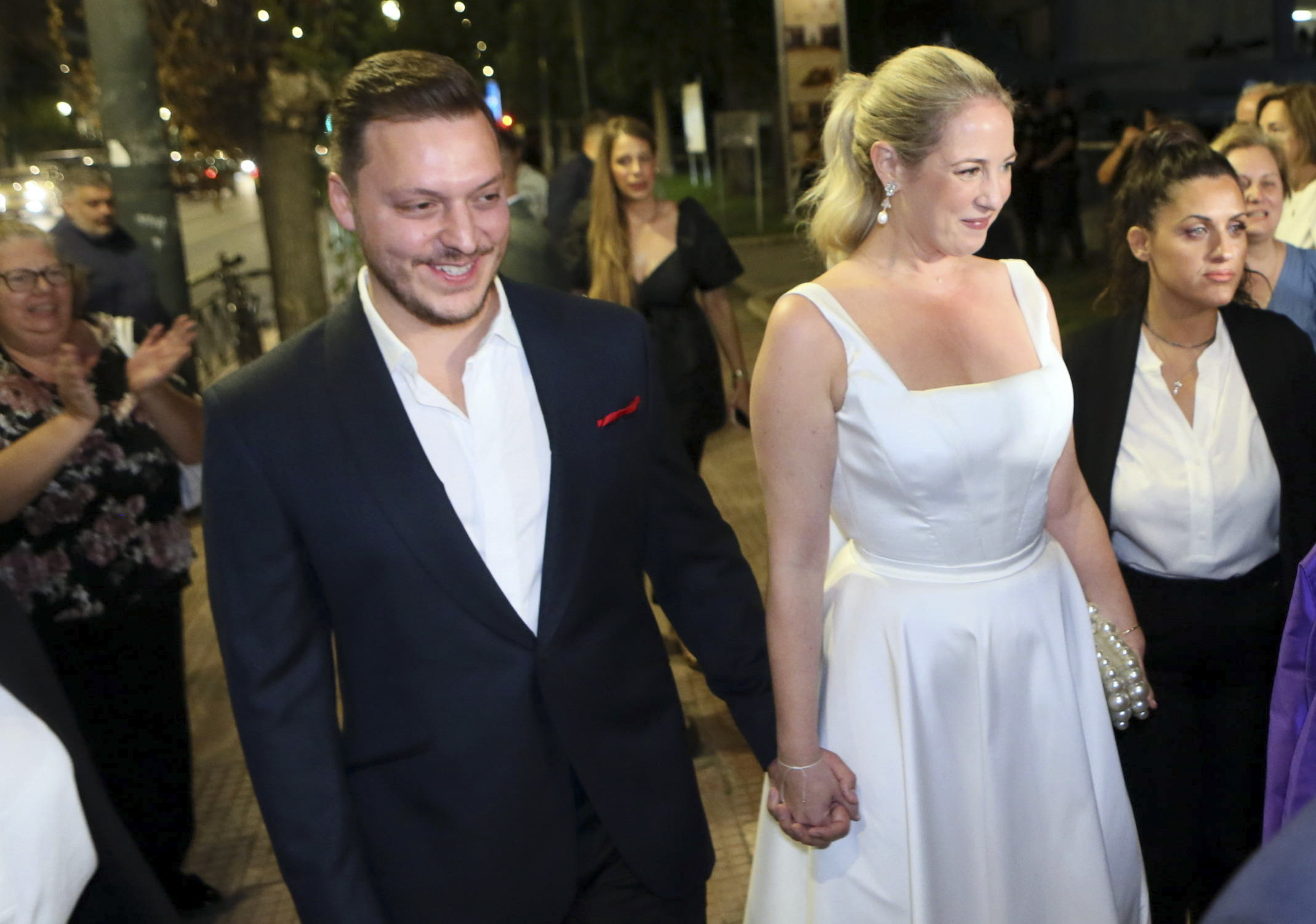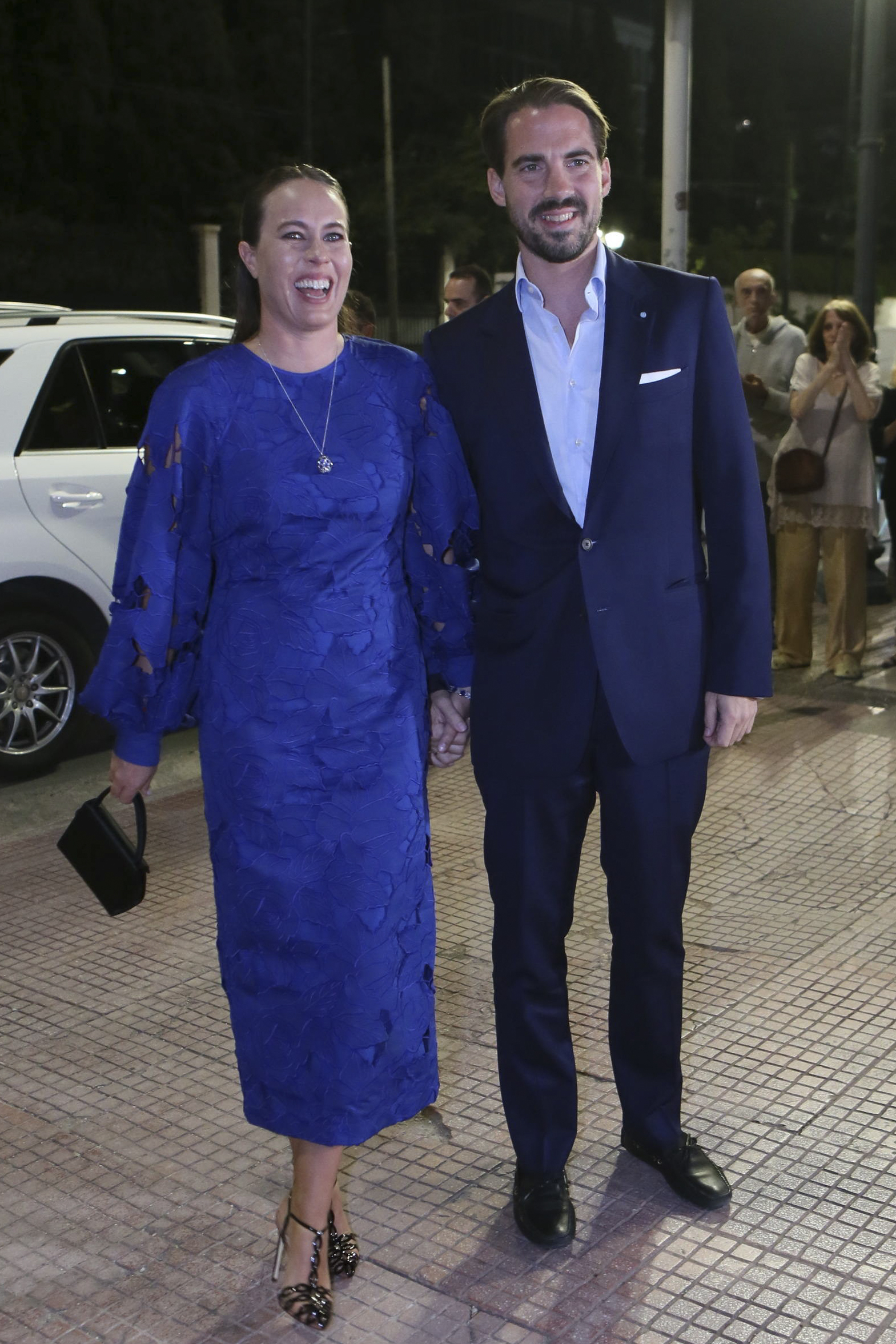 Los novios en su fiesta preboda: Teodora de Grecia y su prometido llegando a la fiesta preboda en el Museo Bizantino de Atenas.