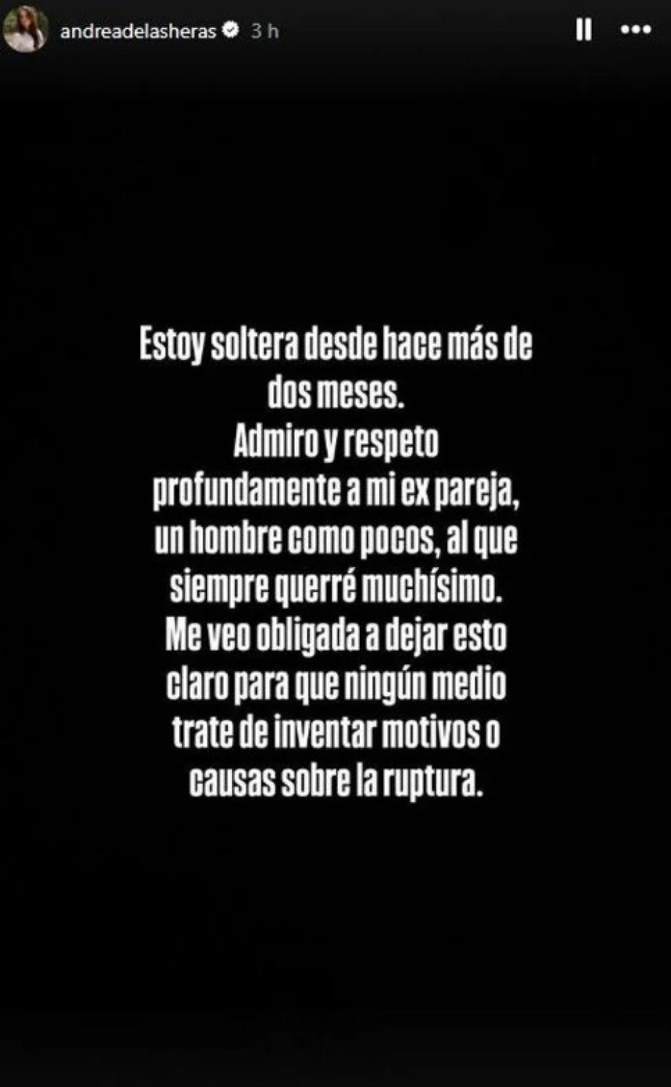 En su mensaje publicado en stories, Andera de las Heras expresó "Estoy soltera desde hace más de dos meses. Admiro y respeto profundamente a mi expareja, un hombre como pocos, al que siempre querré muchísimo. Me veo obligada a dejar esto claro para que ningún medio trate de inventar motivos o causas sobre la ruptura", escribió sin especificar cuáles han sido las causas de la ruptura y dejando entrever que el final de la relación se ha producido de manera amistosa.