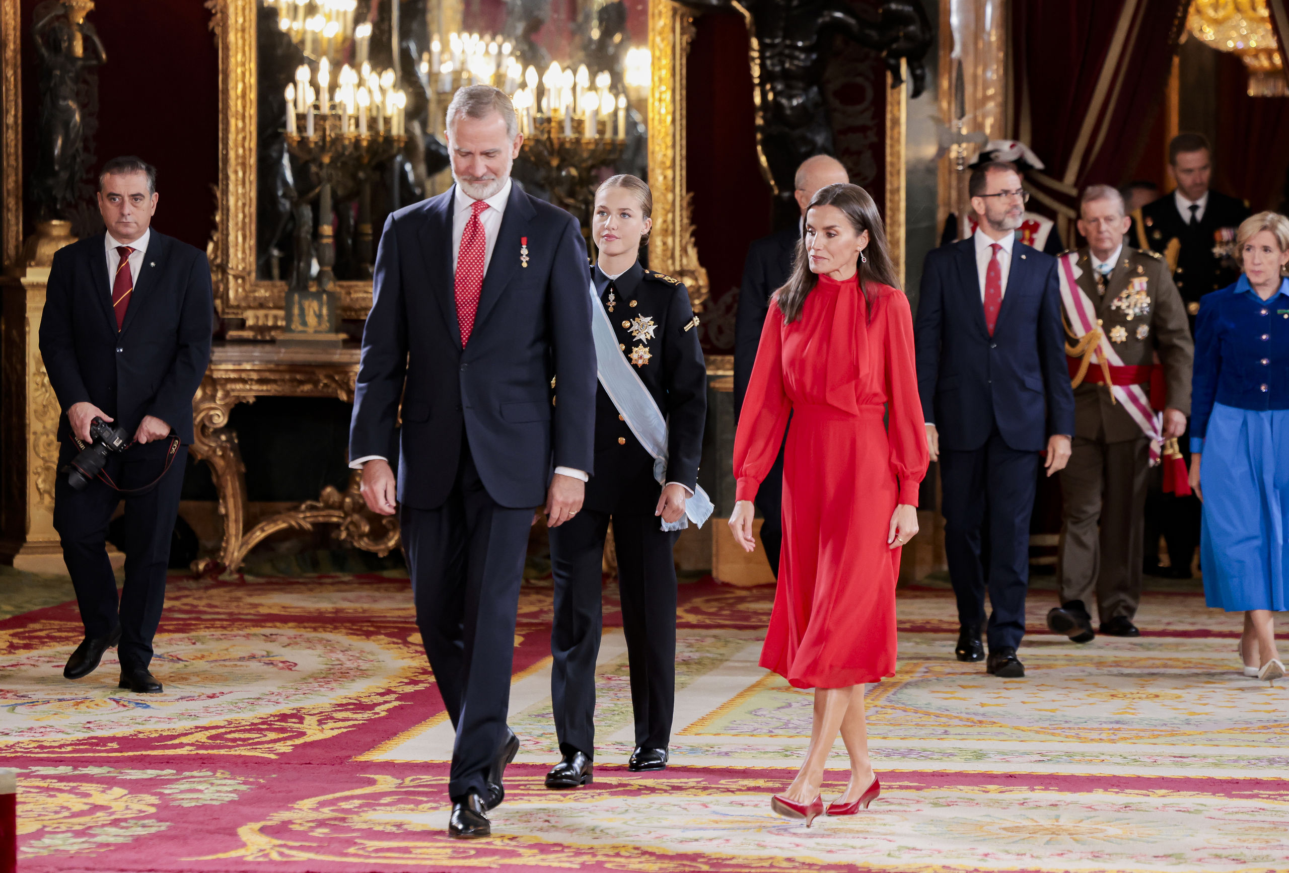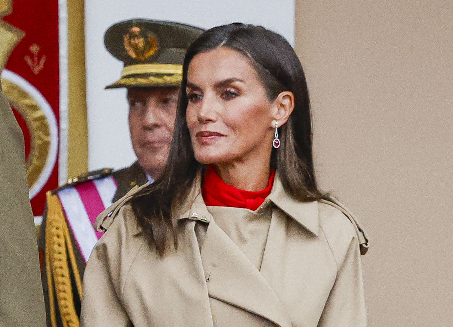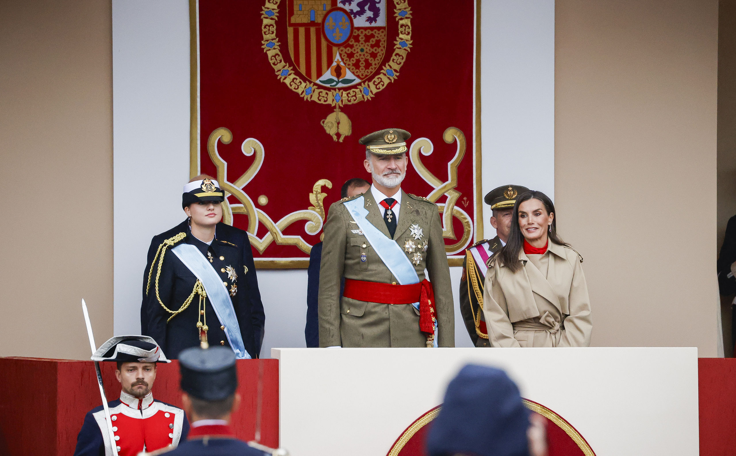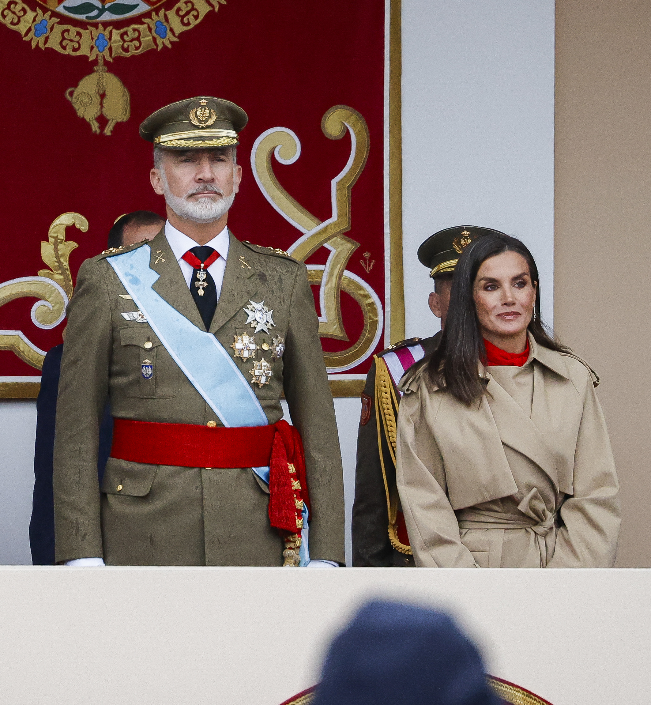 Los reyes Felipe VI y Letizia presiden, junto a la Princesa de Asturias, el desfile militar que recorre hoy la Castellana por el Día de la Hispanidad. Una jornada pasa por agua que a primera hora de la mañana nos impedía ver el look elegido por doña Letizia, aunque dejaba entrever un vestido en rojo bajo una gabardina de estreno en color camel.