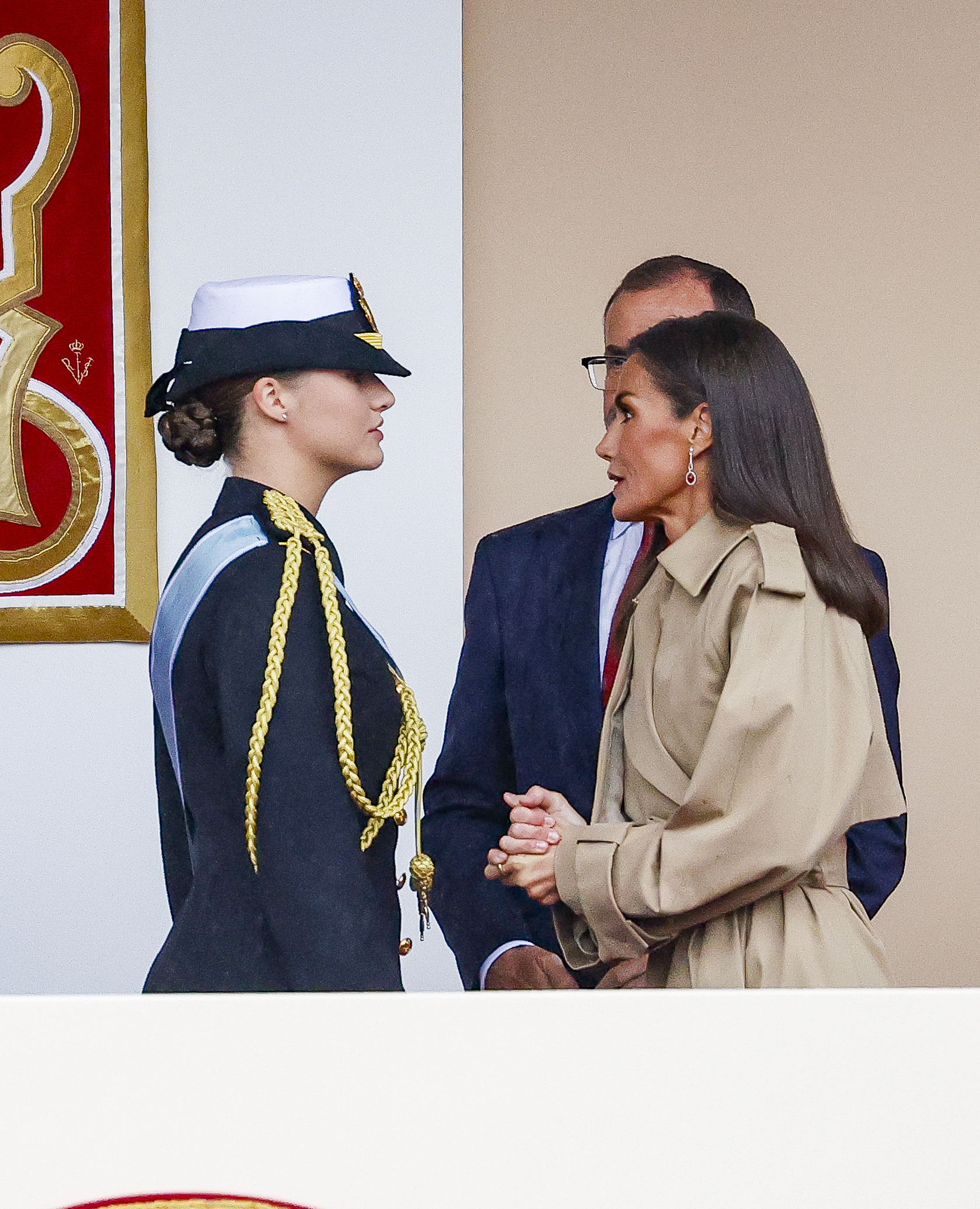 En su cabello, la reina Letiza ha optado por la sencillez, dejando su pelo suelto. En sus orejas destacan unos espectaculares rubíes que combinaban a la perfección con el rojo de su vestido. En la foto, charlando con su hija antes del comienzo del desfile.