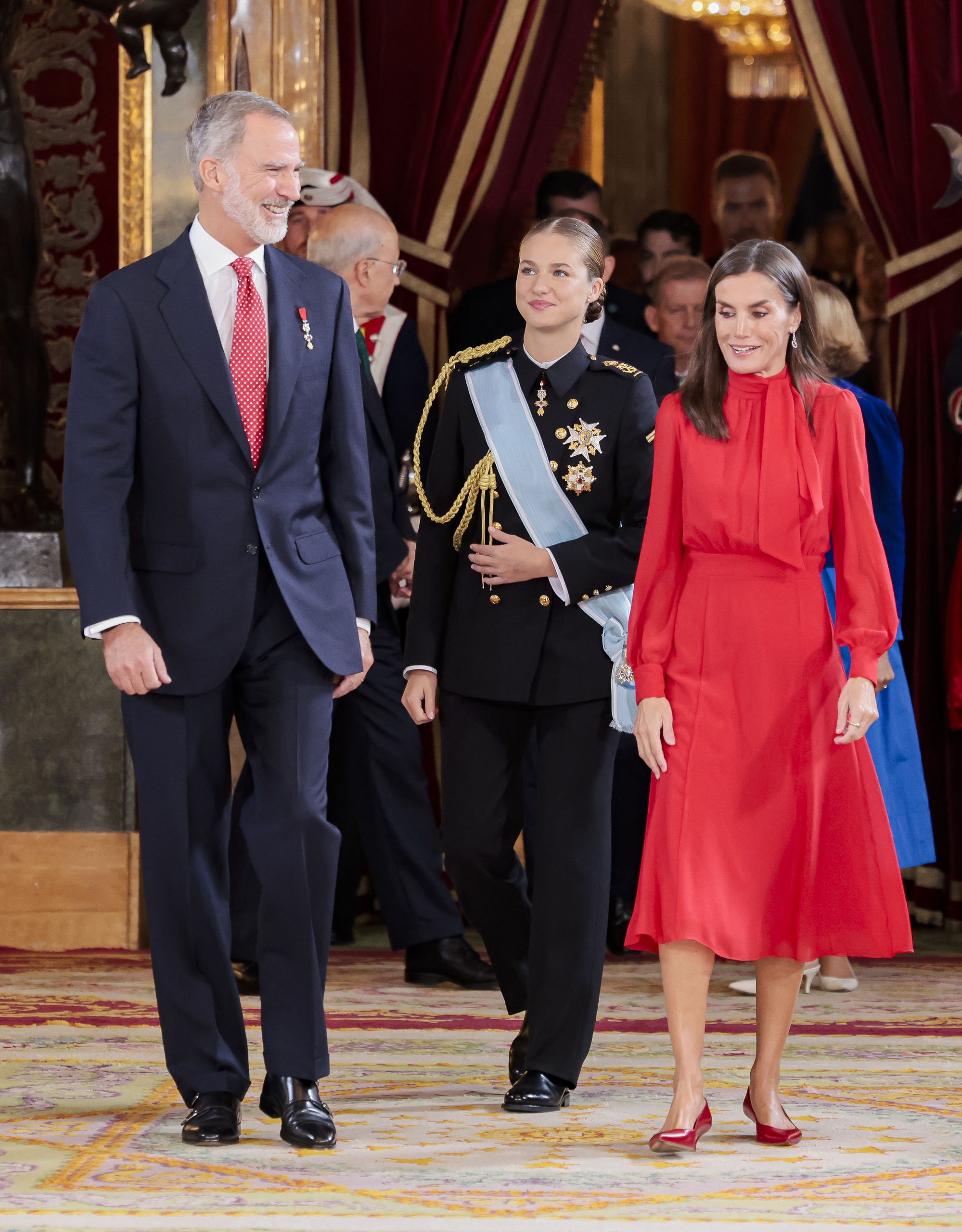 Ya sin lluvia y a resguardo en el Palacio Real hemos podido ver los kitten heels de Magrit que lucía en sus pies. Una elección que eleva al máximo el look, confirmando el acierto de doña Letizia. En la imagen vemos a la Reina acompañando a su marido y a su hija a la recepción de autoridades la Familia Real se ha mostrado tan amable y cercana como siempre. Eso sí, sin la presencia de la infanta Sofía, que este año se ha perdido uno de sus días favoritos por estar estudiando en Gales.