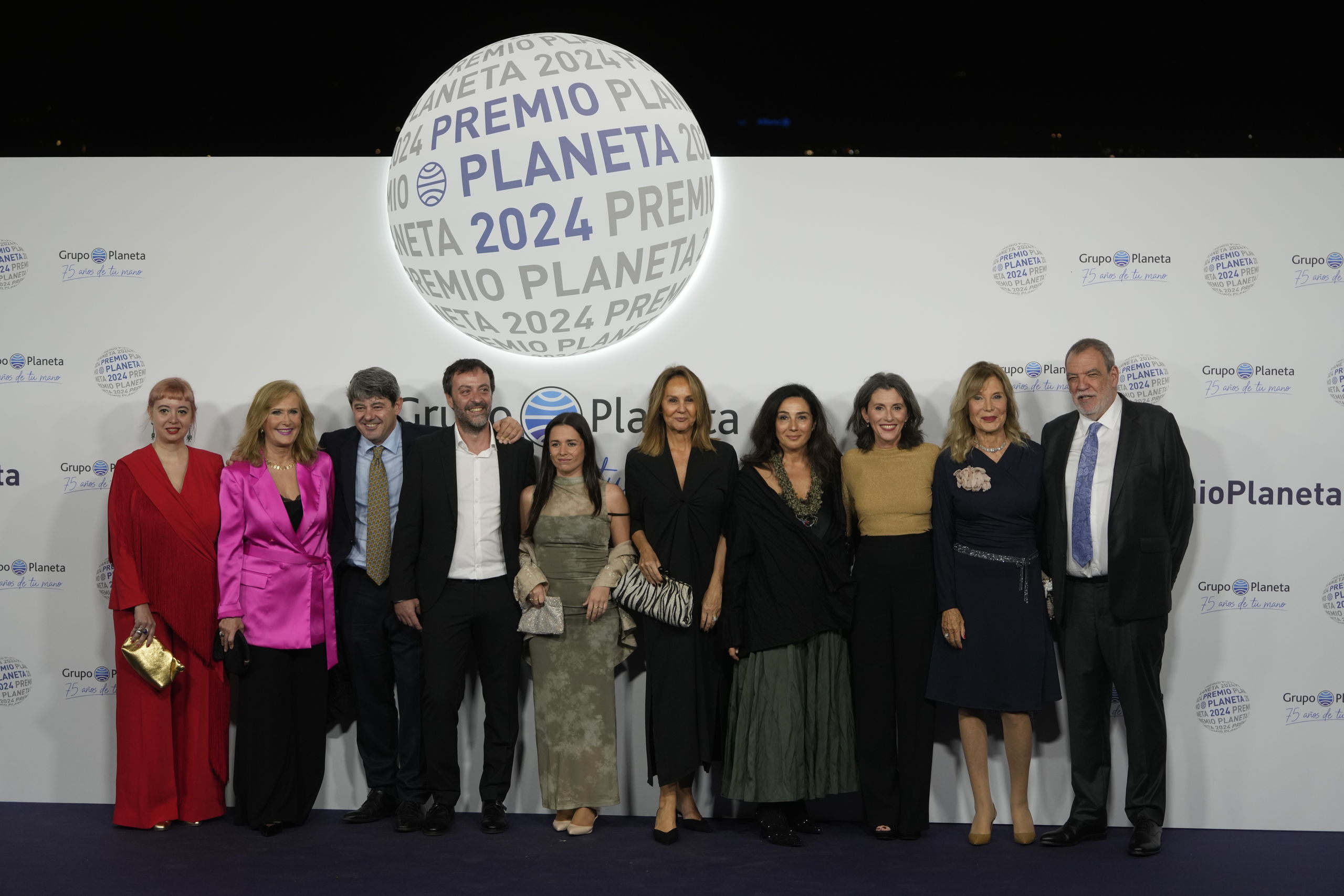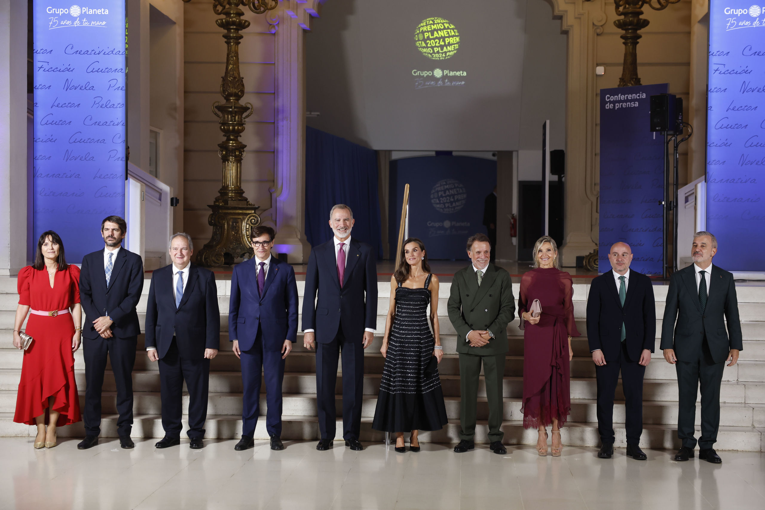 Los Reyes posando con las autoridades asistentes al 75 Premio Planeta, con el ministro de Cultura, Ernest Urstasun, el de Industria y Turismo, Jordi Hereu, el presidente de la Generalidad, Salvador Illa, el alcalde de Barcelona, Jaume Collboni, así como el presidente de Planeta, José Crehueras acompañado de su esposa, Columna Martí.