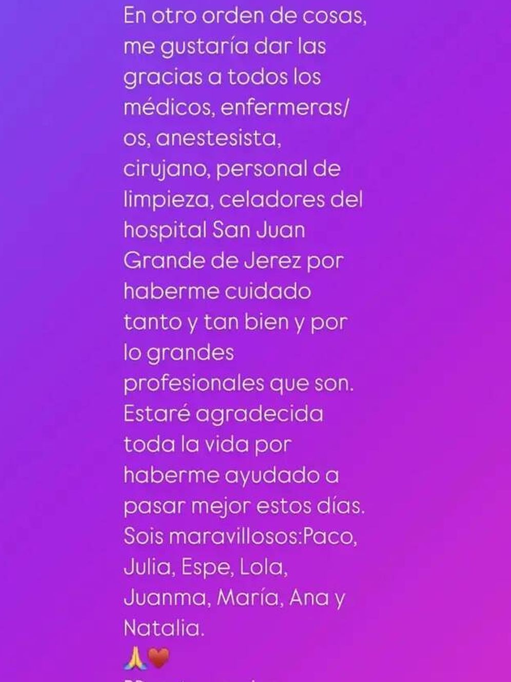 En sus historias de Instagram ha querido lanzar un mensaje de agradecimiento a todo el personal sanitario del centro donde la han atendido: "En otro orden de cosas, me gustaría dar las gracias a todos los médicos, enfermeras/os, anestesista, cirujano, personal de limpieza, celadores del hospital San Juan Grande Jerez por haberme cuidado tanto y tan bien y por lo grandes profesionales que son. Estaré agradecida toda la vida por haberme ayudado a pasar mejor estos días. Sois maravillosos Paco, Julia, Espe, Lola, Juanma, María, Ana y Natalia".
