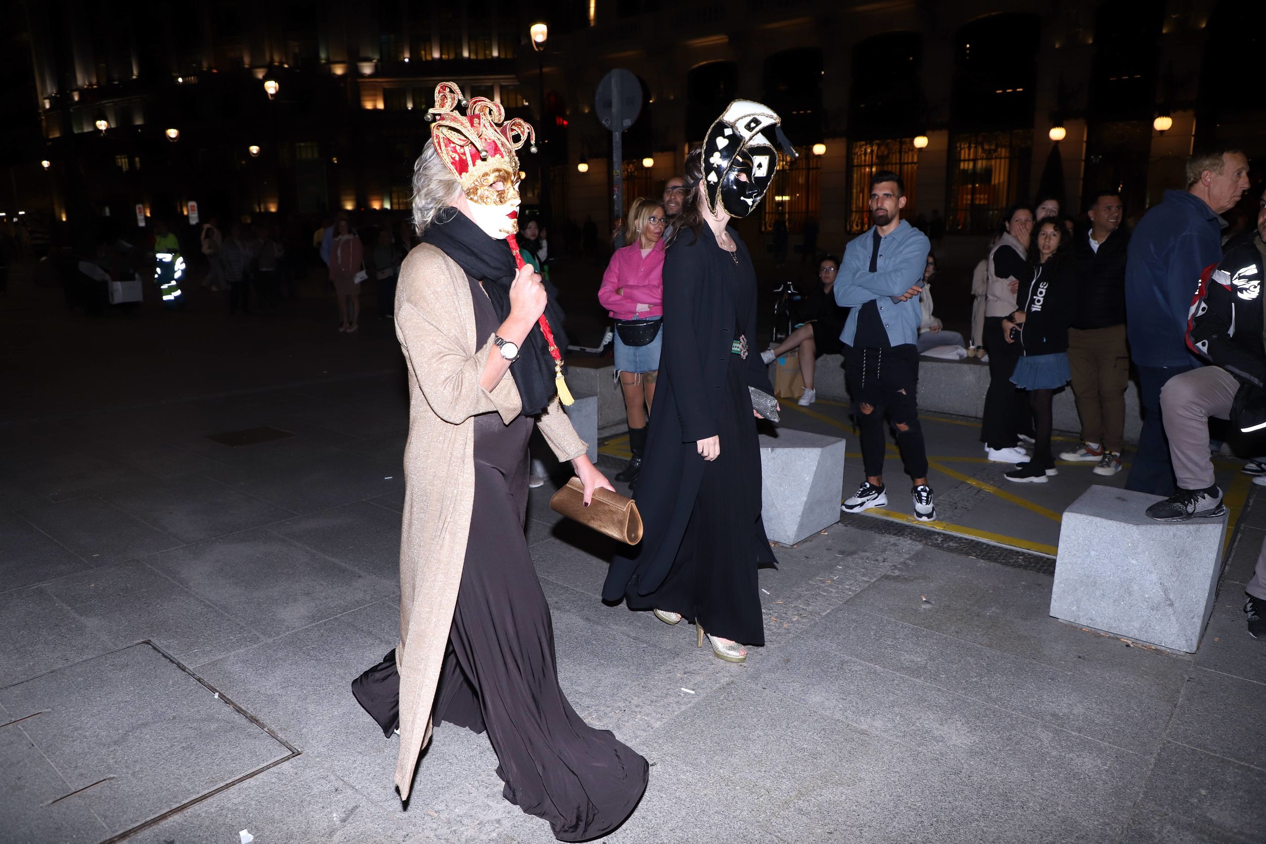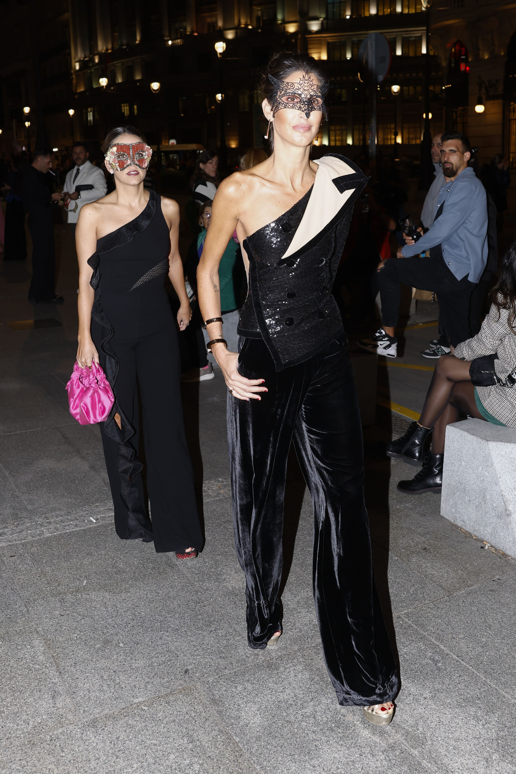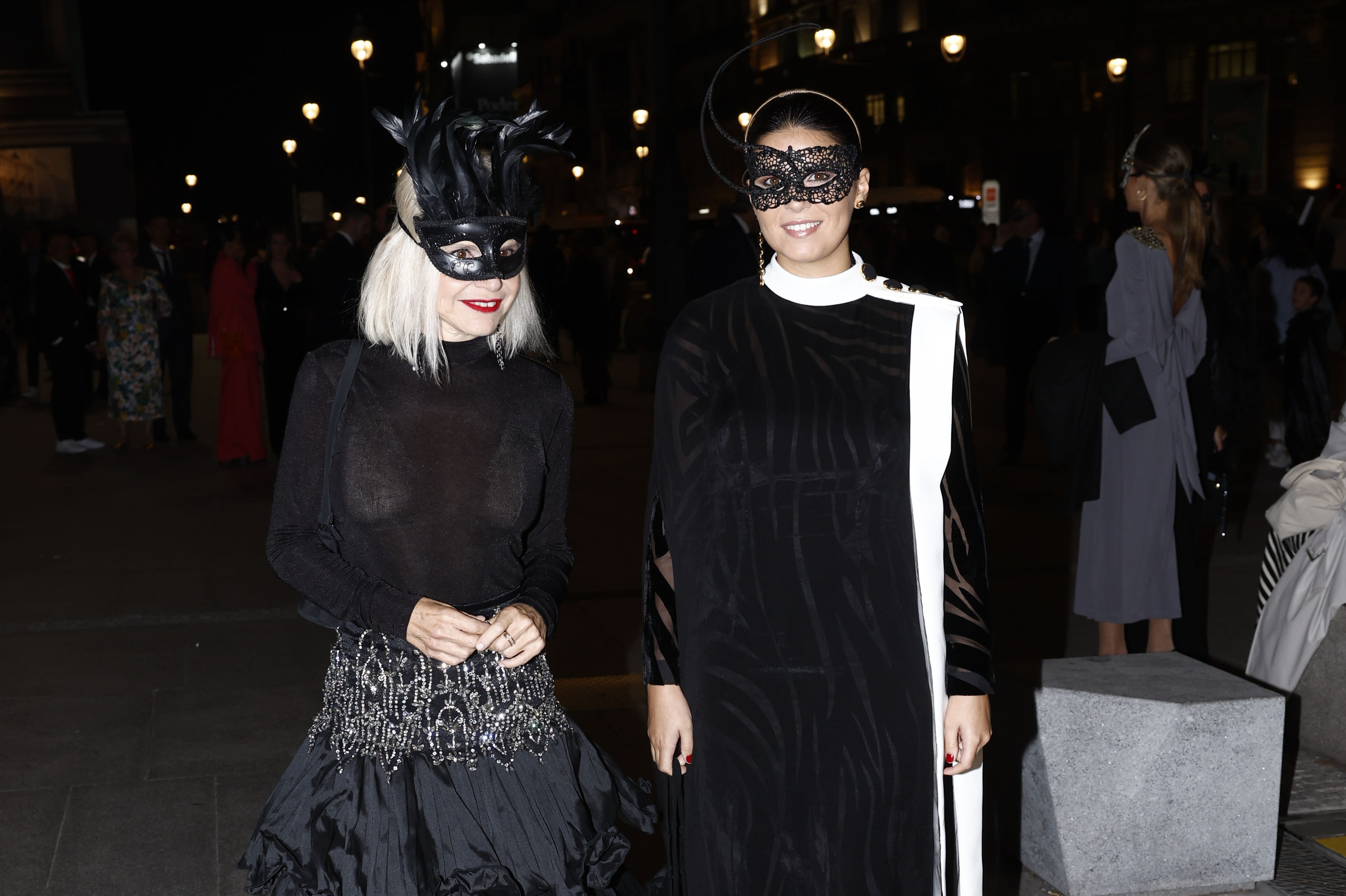 Cayetana Rivera Martínez de Irujo, a su llegada a la fiesta de cumpleaños en compañía de su madre, Eugenia Martíenz de Irujo, ambas muy elegantes en engro y con máscaras.