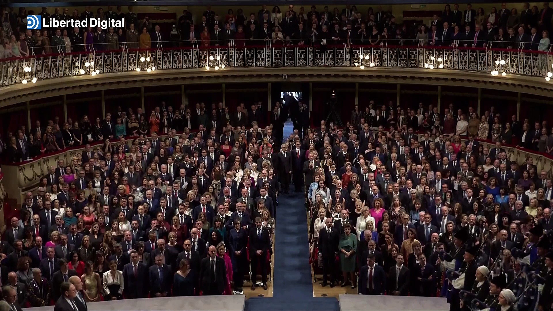 Concluye el discurso de S. M. el Rey y la Familia Real, junto a todo el Teatro Campoamor, canta el Himno de Asturias interpretado por la Real Banda de Gaitas Ciudad de Oviedo.