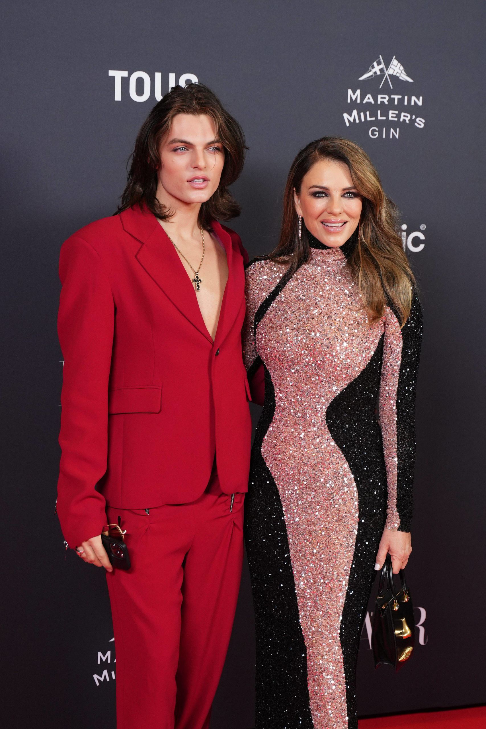 La actriz Elizabeth Hurley, con vestido de Schiaparelli, que asistió al evento acompañada de su hijo Damian.