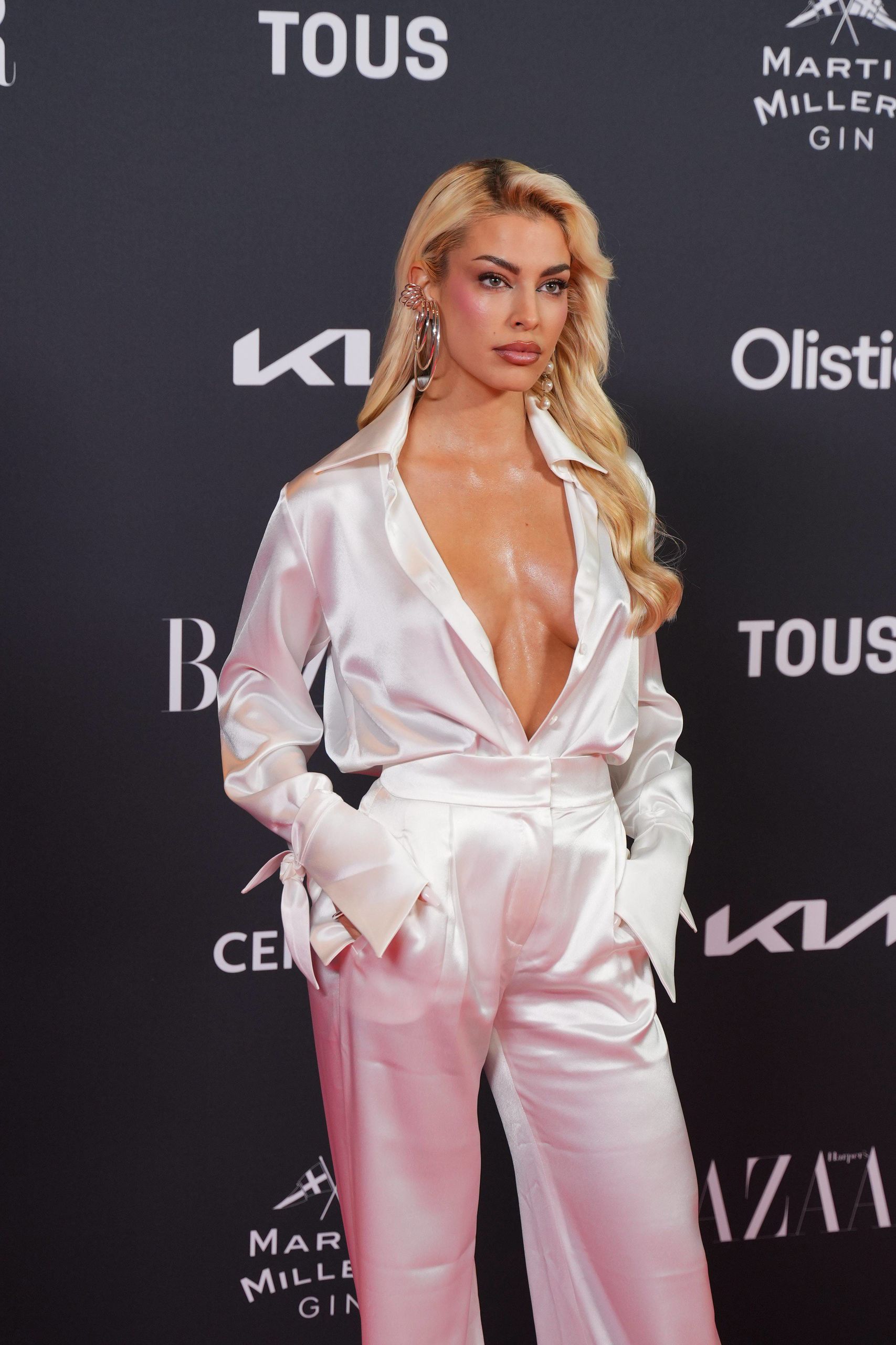 Jessica Goicoechea, con total look en blanco y camisa de amplio escote de Claro Couture.