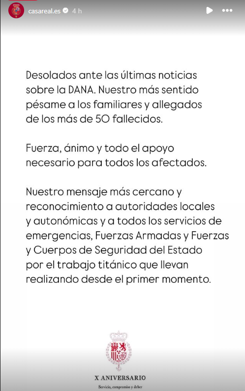 El mensaje de Don Felipe y Doña Letizia no se ha hecho esperar, y Zarzuela ha emitido un comunciado urgente donde se recogían las palabras de conmoción por parte de los Reyes. "Desolados ante las últimas noticias sobre la DANA. Nuestro más sentido pésame a los familiares y allegados de los más de 50 fallecidos. Fuerza ánimo y todo el apoyo necesario para todos los afectados".