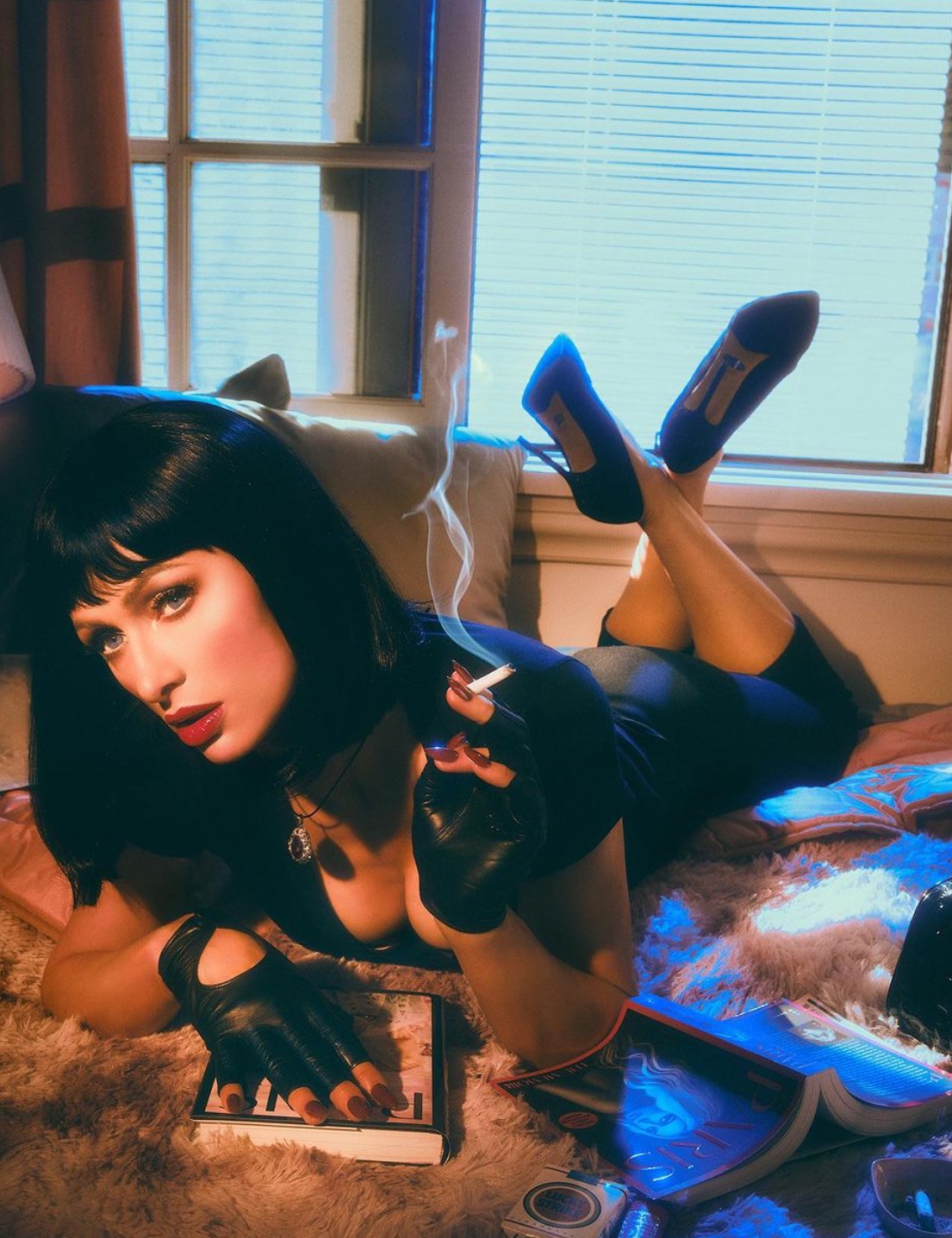 Paris Hilton caracterizada como la icónica protagonista de Pulp Fiction, Mia Wallace.