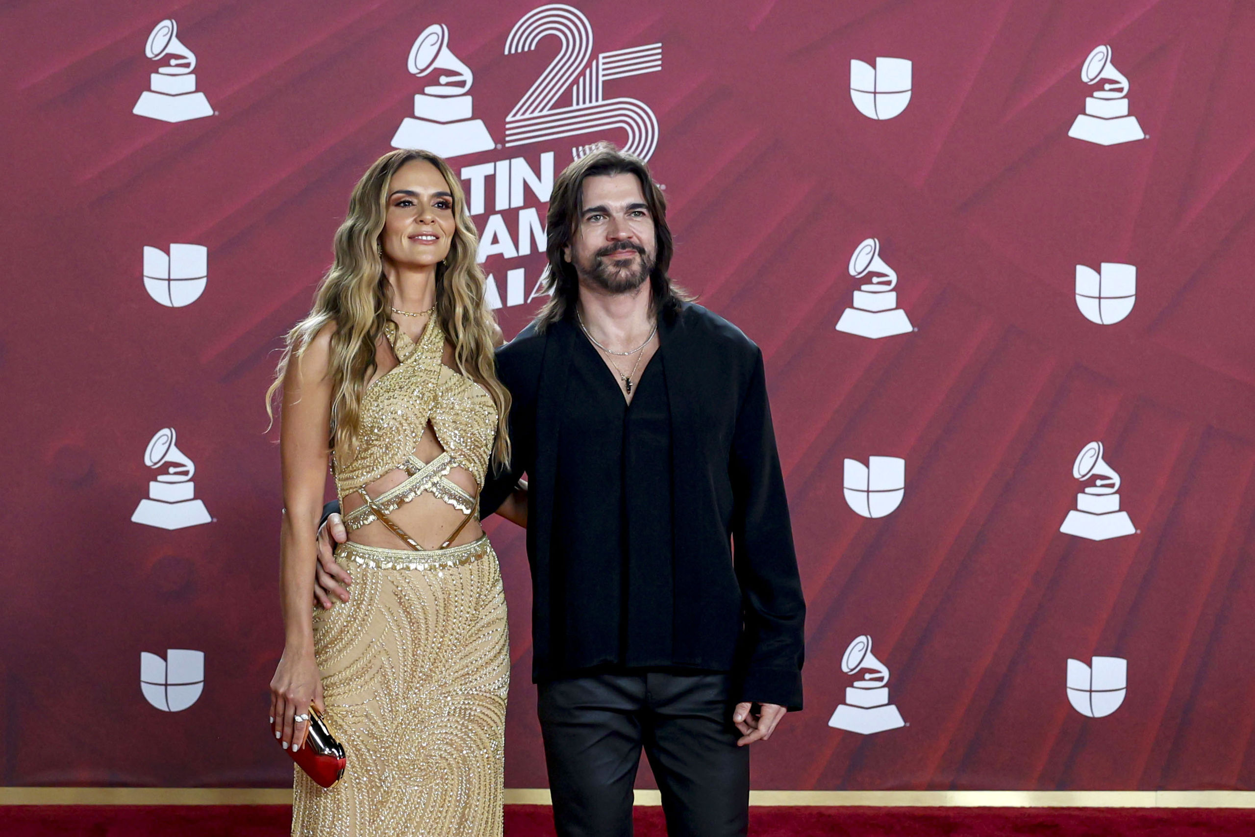 El cantante Marc Anthony y su esposa la modelo paraguaya Nadia Ferreira posan en la alfombra roja de la 25 entrega anual de los Premios Latin Grammy