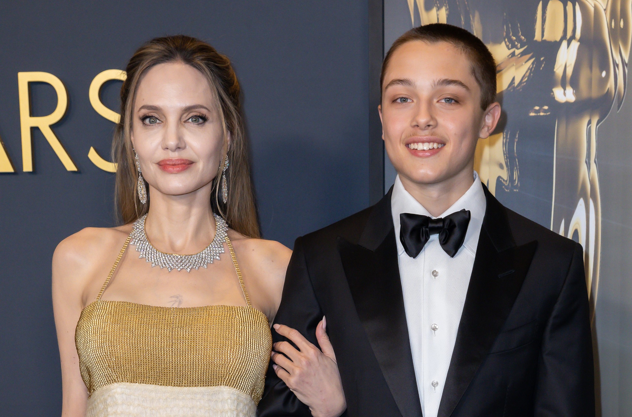 Su acompañante fue su hijo menor Knox, de 16 años y mellizo de Vivienne, que lució un elegante esmoquin y posó muy sonriente para los fotógrafos junto a su madre, mostrando su gran parecido a sus famosos padres. En cuanto a la orgullosa madre, siempre reluciente, brilló con un vestido de corte imperio con escote dorado y encaje adquirido en The Kit Vintage y joyas de diamantes.
