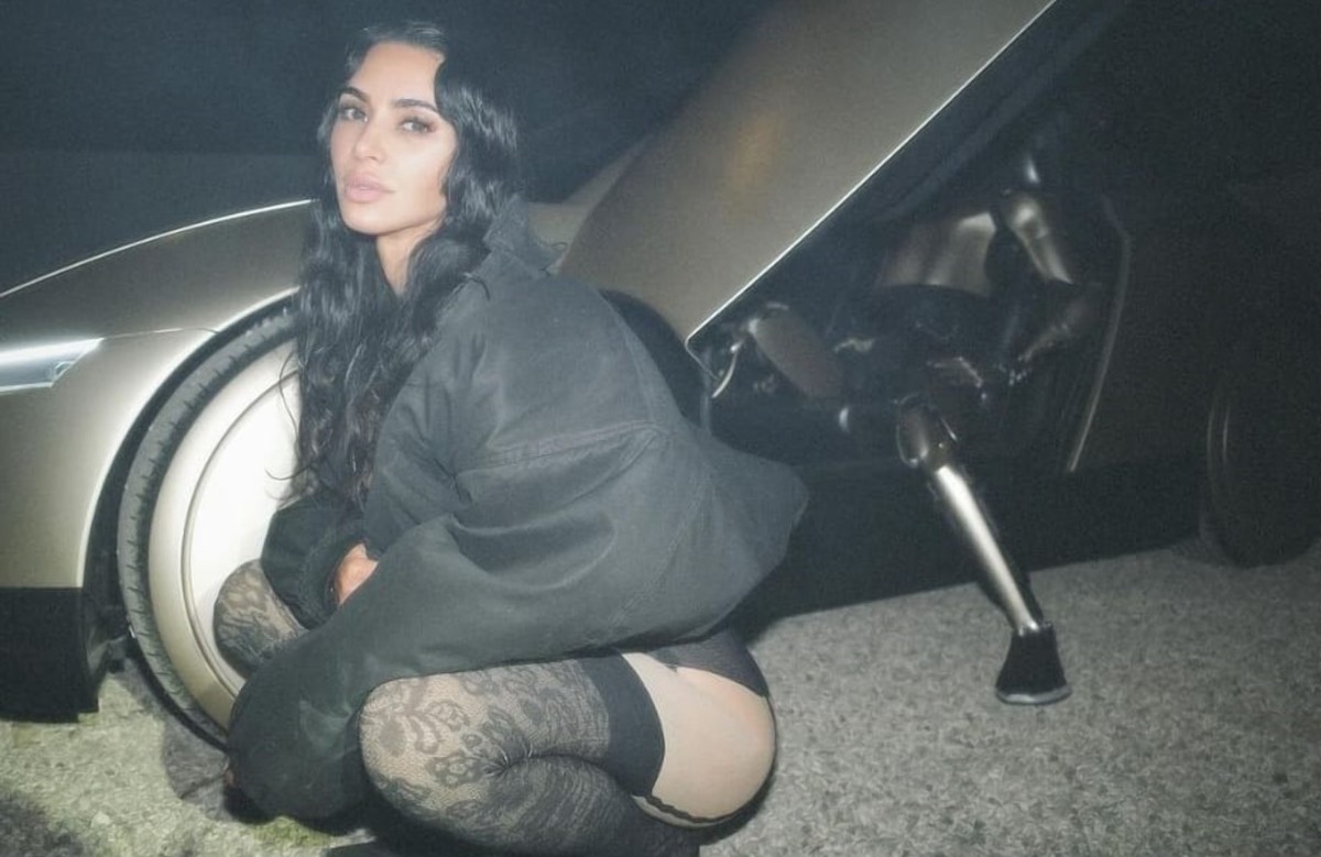 Kim se valió de unas medias color carne con el diseño de un liguero negro y unas medias, tacones de punta y una chaqueta negra para su provocador posado.