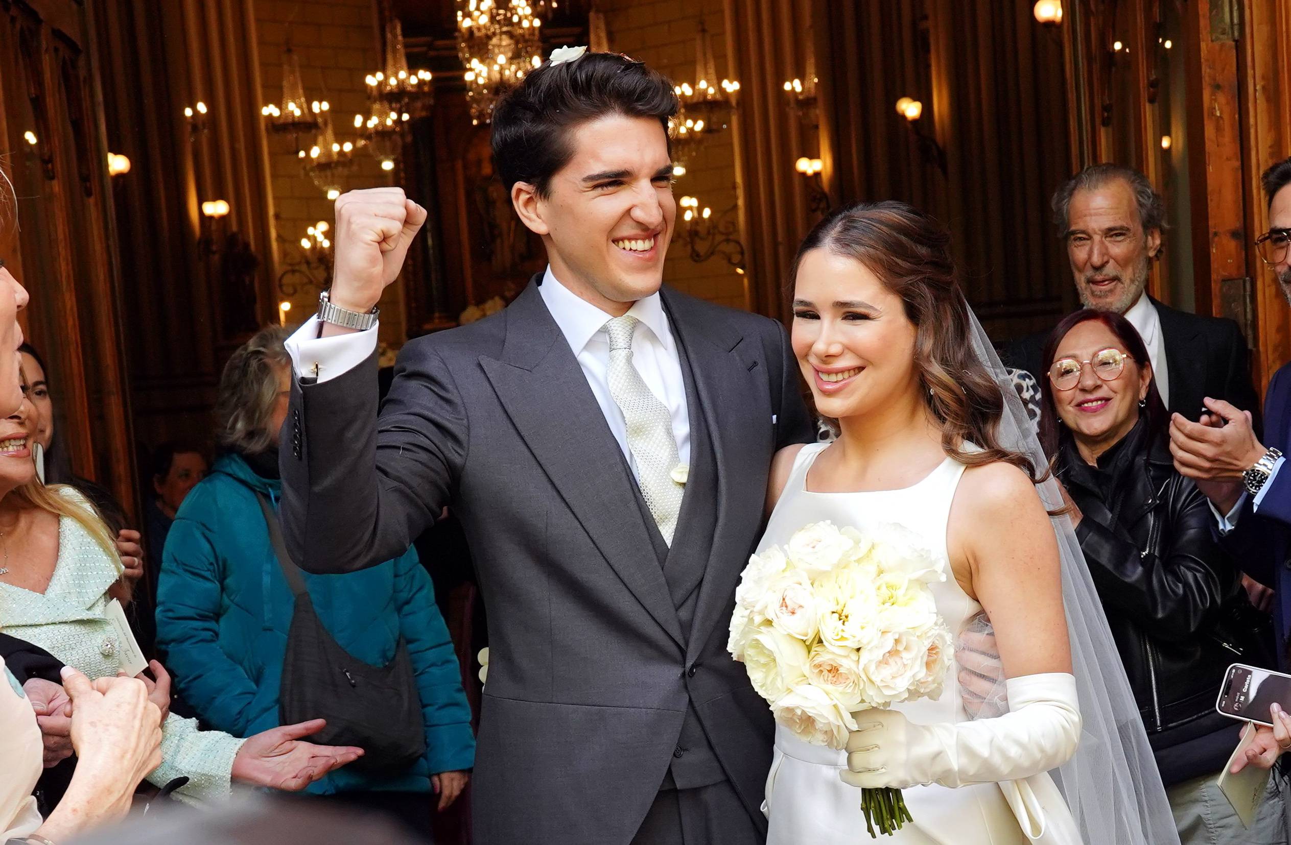 Javier García Obregón Lago y Eugenia Gil Muñoz, convertidos en marido y mujer, a su salida de la iglesia de San Fermín de los Navarros de Madrid donde se casaron el pasado 1 de mayo.