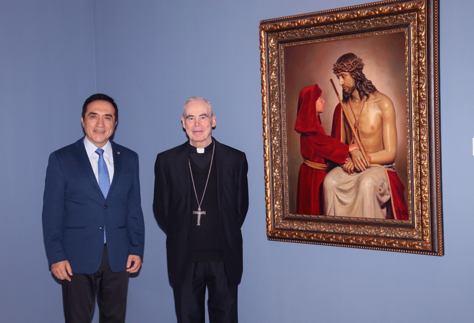 Antonio Montiel frente al cartel de la exposición: Antonio Montiel: De lo divino a lo humano.