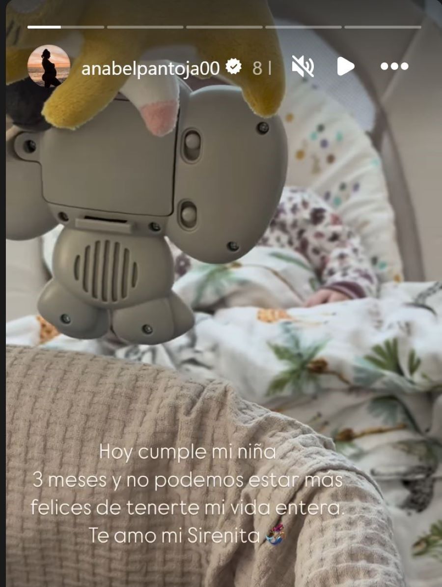 Junto a un vídeo en el que se observa a la bebé moviendo sus brazos mientras suena una canción infantil de fondo, Anabel ha escrito: "Hoy cumple mi niña tres meses. No podemos estar más felices de tenerte, mi vida entera. Te amo mi sirenita". La siguiente imagen mostraba una mesa para varios comensales a punto de comenzar a comer para celebrar los tres meses de vida de su pequeña con el título de "celebración cordobesa". También hemos visto como preparaban una barbacoa e incluso una tarta con una vela del número 3 del cumplemés de la pequeña con un mensaje: "Gracias por existir".
