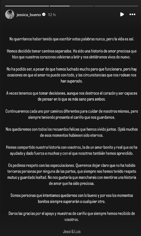 Tal y como han dejado claro en su comunicado, y en cuanto al fin de su relación han añadido que "Os pedimos respeto con las especulaciones. Queremos dejar claro que no ha habido terceras personas por ninguna de las partes, que hemos sido increíblemente felices y que todo ha guardado lealtad. No nos gustaría que mancharais con mentiras lo que para nosotros ha sido bonito y real. Somos personas que intentamos quedarnos con lo bueno y por eso los momentos bonitos siempre superarán a cualquier otro. Daros las gracias por el apoyo y muestras de cariño que siempre hemos recibido de vosotros. Jessi & Luis".