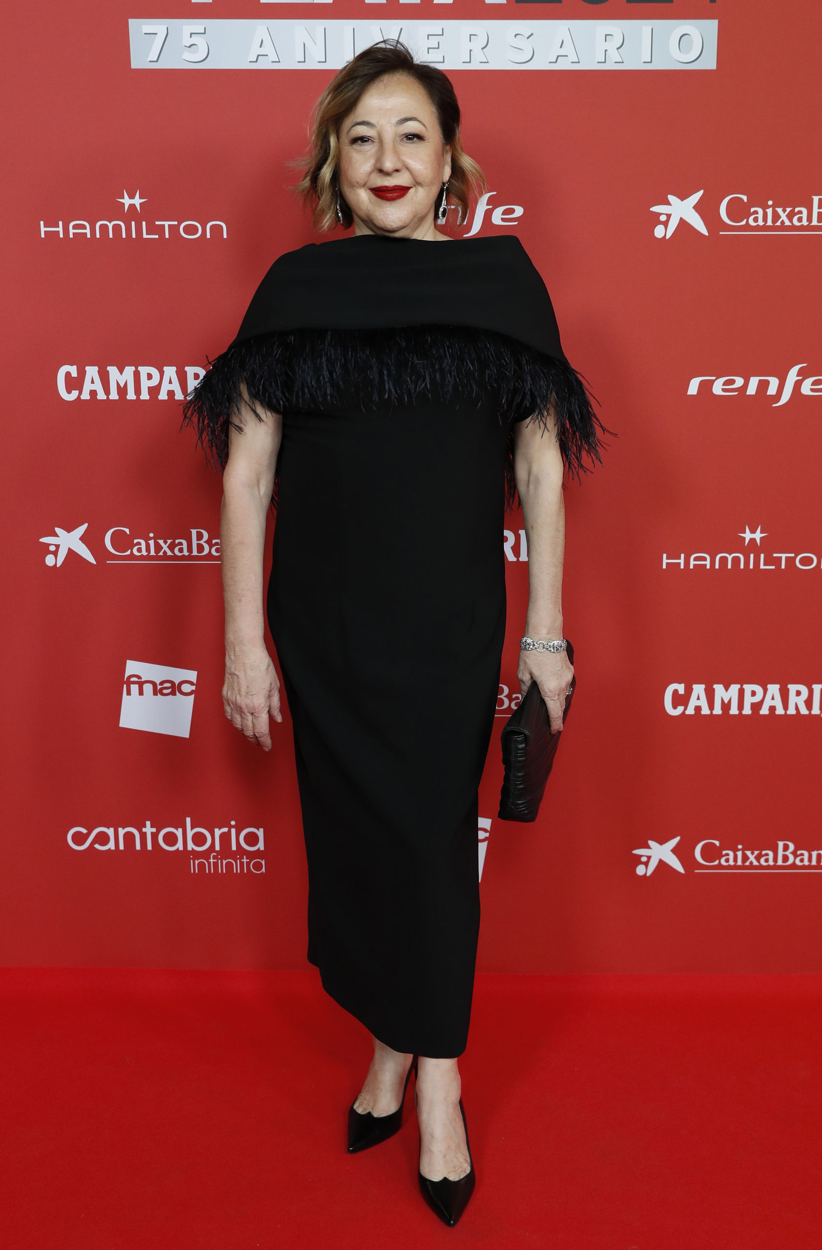 La actriz que se encuentra inmersa en la grabación de la película de Aida, triunfó con un elegante vestido largo de corte recto y plumas al cuello.