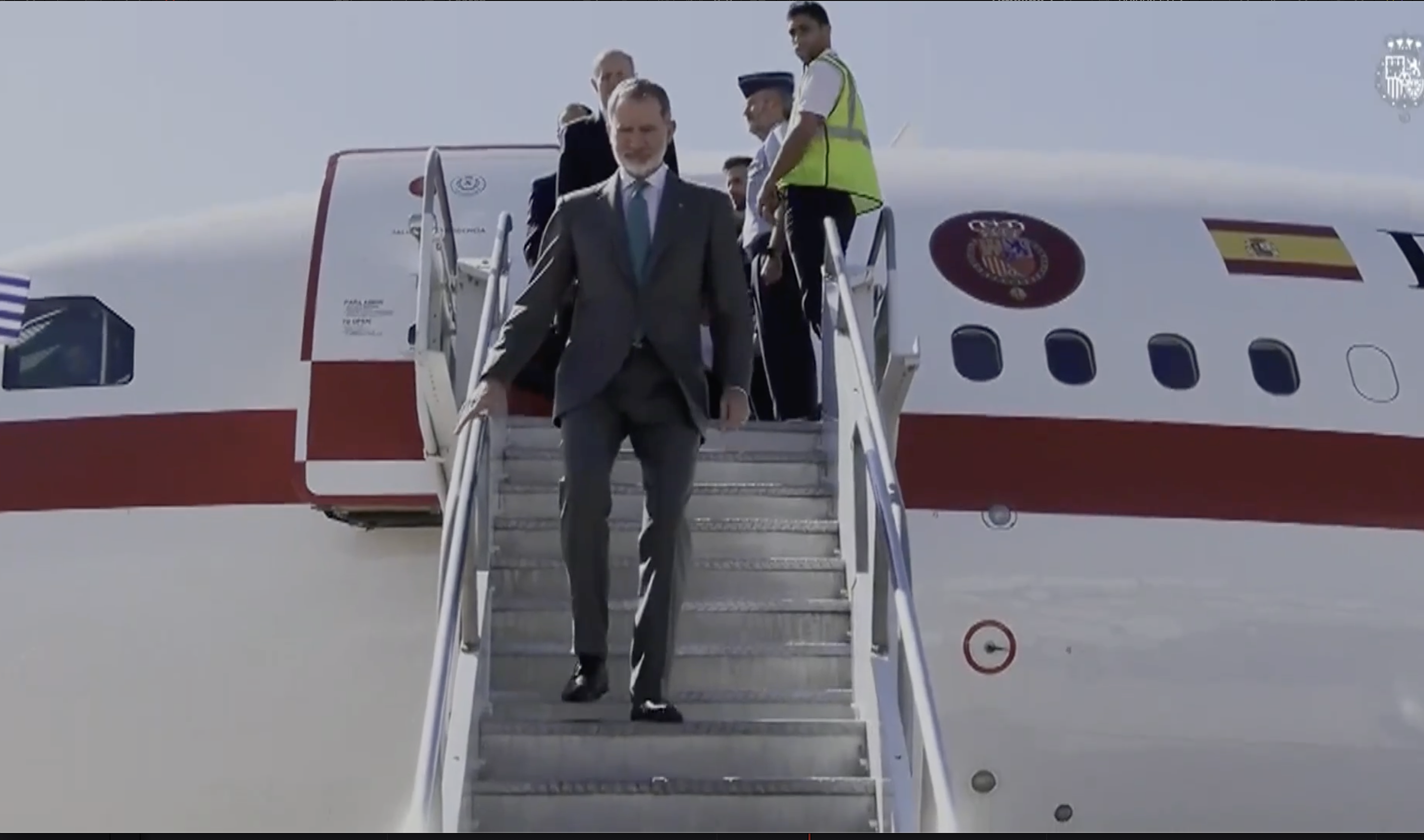 El monarca español aterrizó en la Base Aérea número 1, situada junto al Aeropuerto Internacional de Carrasco, y, tras su llegada, se dirigió al hotel donde se hospedará durante su estancia en la capital uruguaya.