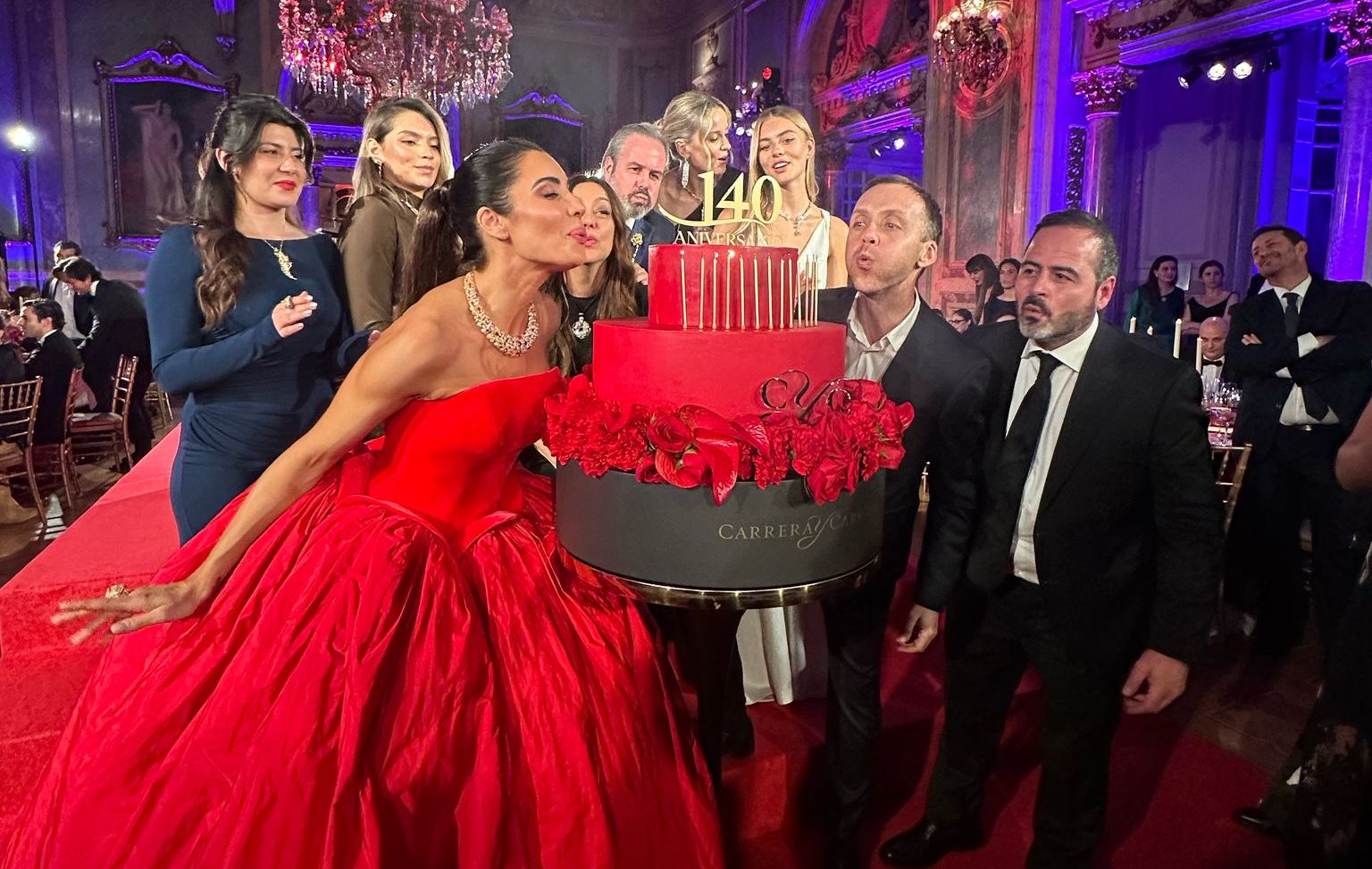 Como se suele decir la firma de joyería Carrera y Carrera, tiró la casa por la ventana, con motivo de su celebración del 140 aniversario. El lugar elegido el Casino de Madrid. El gran salón decorado de rojo, color de la firma, y muchas de las invitadas también se decantaron por el mismo tono. Pilar rubio, fue la musa de la velada, con un impresionante diseño de Jorge Redondo, el cuerpo de terciopelo y la abullonada falda de tafetán, sin olvidar el magnifico collar de oro y piedras preciosas, haciendo juego con el anillo, ni que decir tiene, que llamaba la atención. " Acabo de llegar de Monterrey, me adapto muy bien, donde nos toque vivir, porque yo voy a seguir trabajando, y viajaré lo que haga falta" Así me comentó. Marta Sánchez, eligió el color negro, y lució un bonito collar de brillantes.