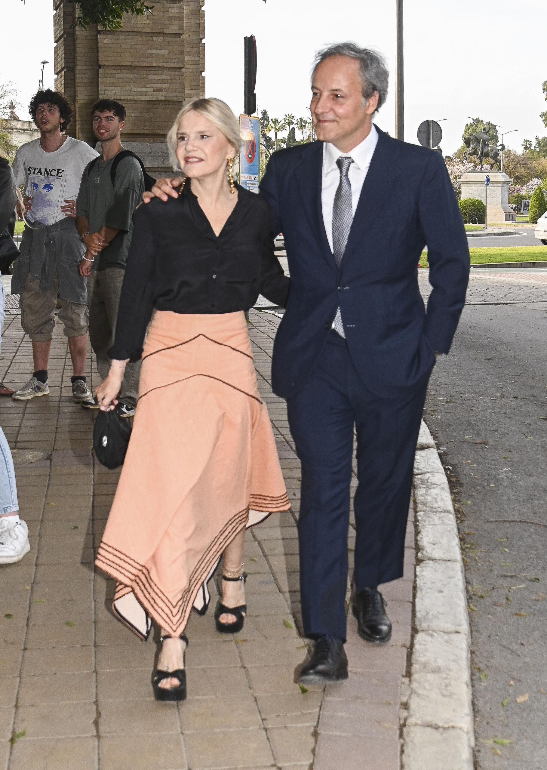 Eugenia Martínez de Irujo fue sin duda la mejor vestida de la jornada con un look firmado por Tana Rivera con un diseño clásico pero sofisticado compuesto por una falda de tiro alto y bajo asimétrico en color salmón y una blusa negra abierta. A su lado, su inseparable novio Narcís Rebollo.