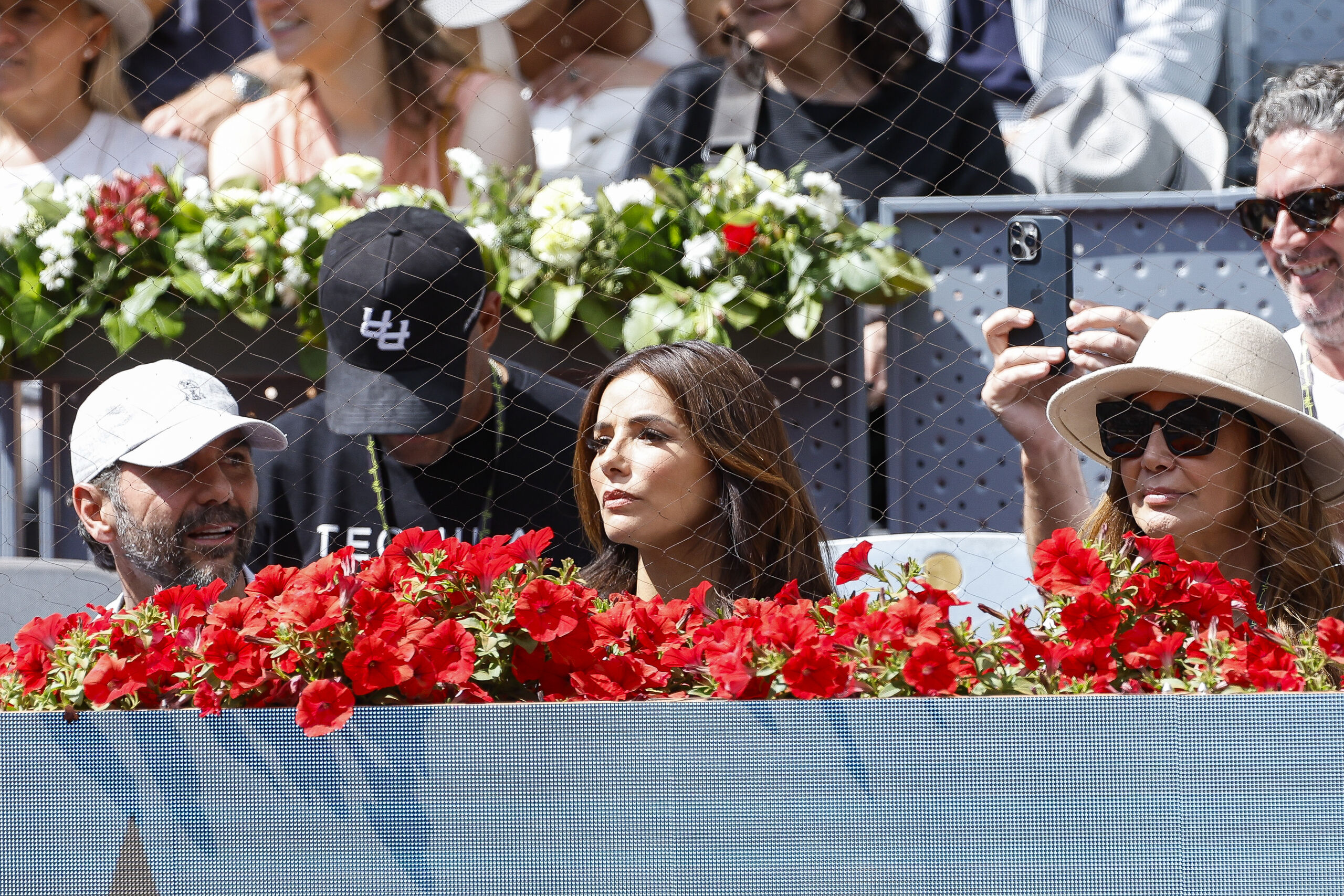 Por la tarde, la actriz ha ocupado un palco VIP en la zona norte de la pista, junto a su marido, Pepe Bastón, el actor Amaury Nolasco y su amiga María Bravo, una de las fundadoras de la ONG Global Gift Foundation, la gala solidaria que anualmente organiza en Marbella, para presenciar el partido entre Matteo Arnaldi y Novak Djokovic. Longoria, ha apostado por un estilismo en azul y gorra para protegerse del sol. Como el sol y el calor apretaban, Eva y María se han retirado del palco que ocupaban buscando la sombra.