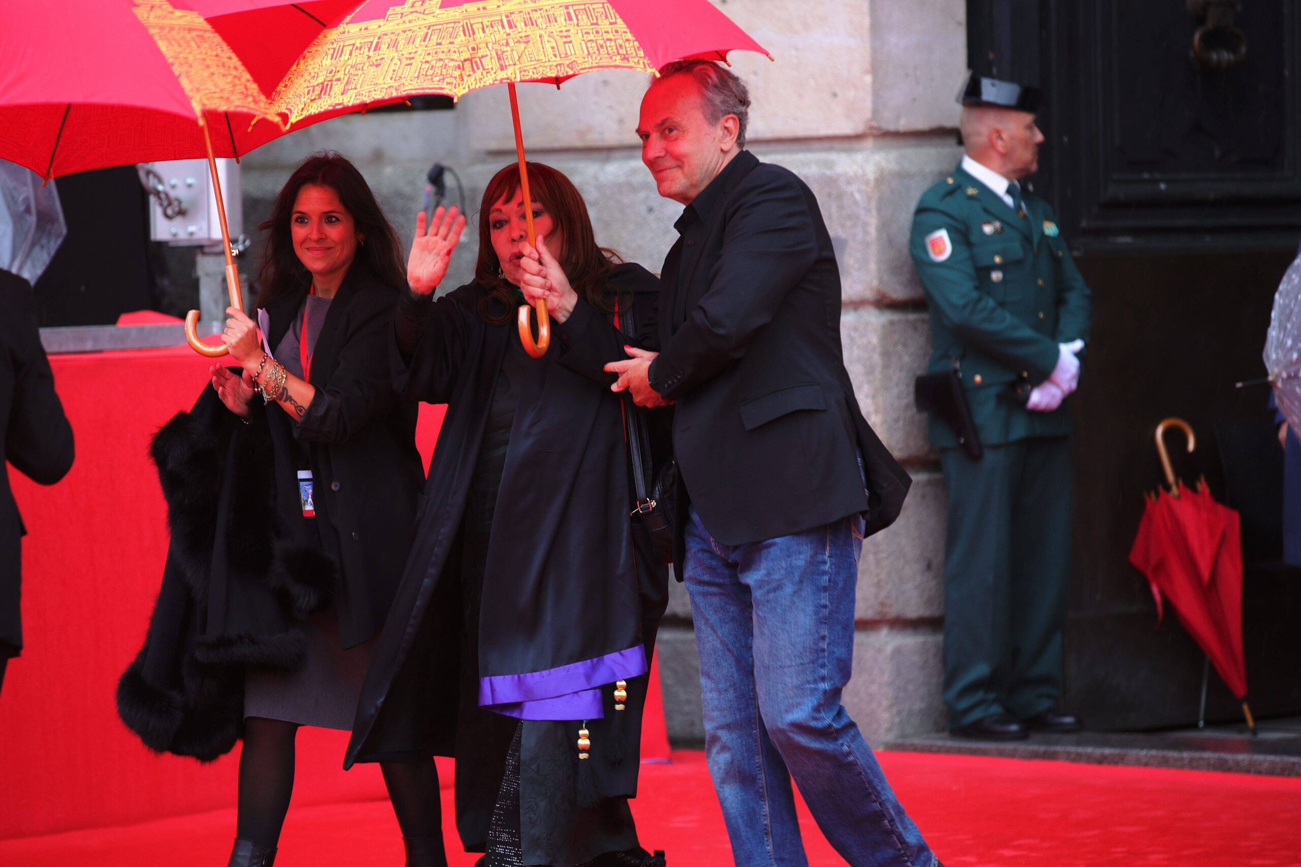 La lluvia ha sido protagonista de la jornada pero no ha impedido que la fiesta se haya celebrado por todo lo alto. En la imagen, José Coronado muy pendiente de la otra premiada, Massiel. El actor ha protegido de la lluvia a su compañera que no se ha soltado de su brazo.