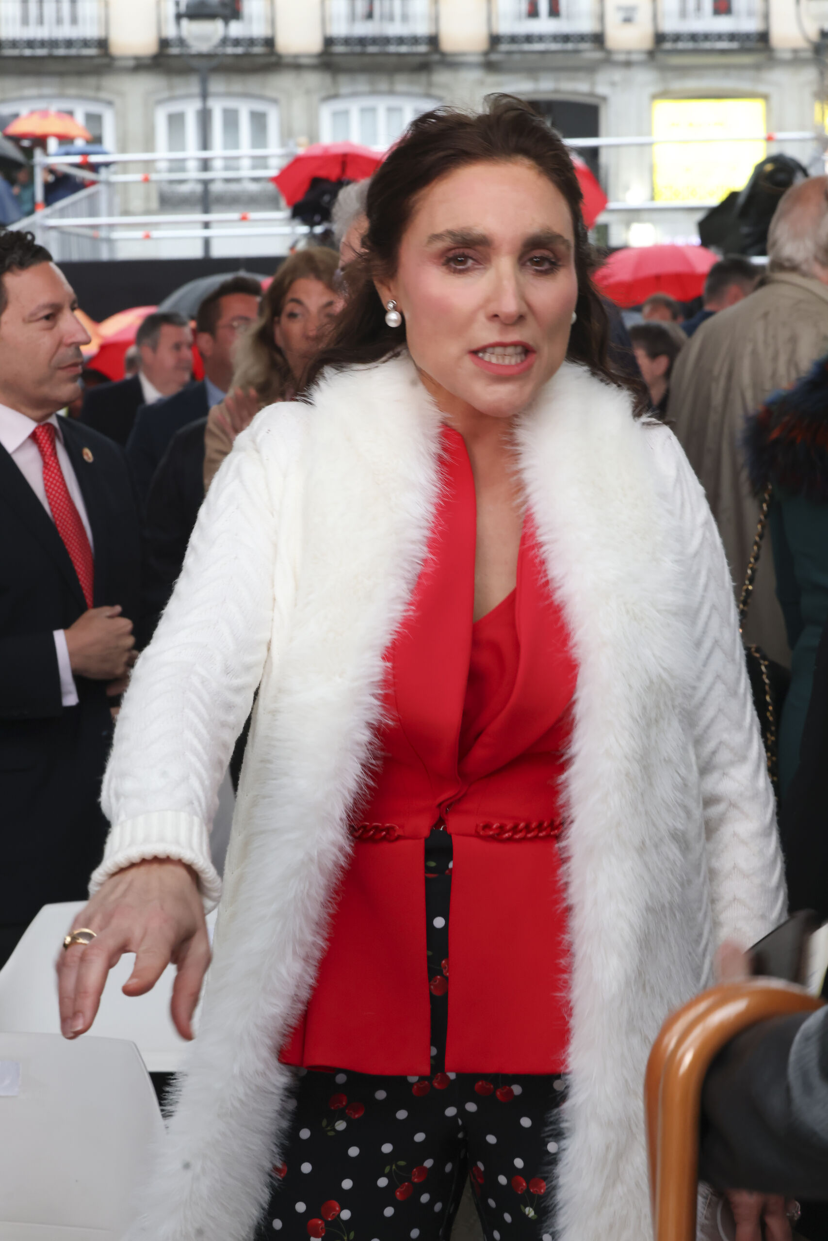 La cantante muy emocionada entre el público asistente, especialmente durante la entrega de la medalla a José Mercé. Se ha protegido de la lluvia y las temperaturas con una gabardina.