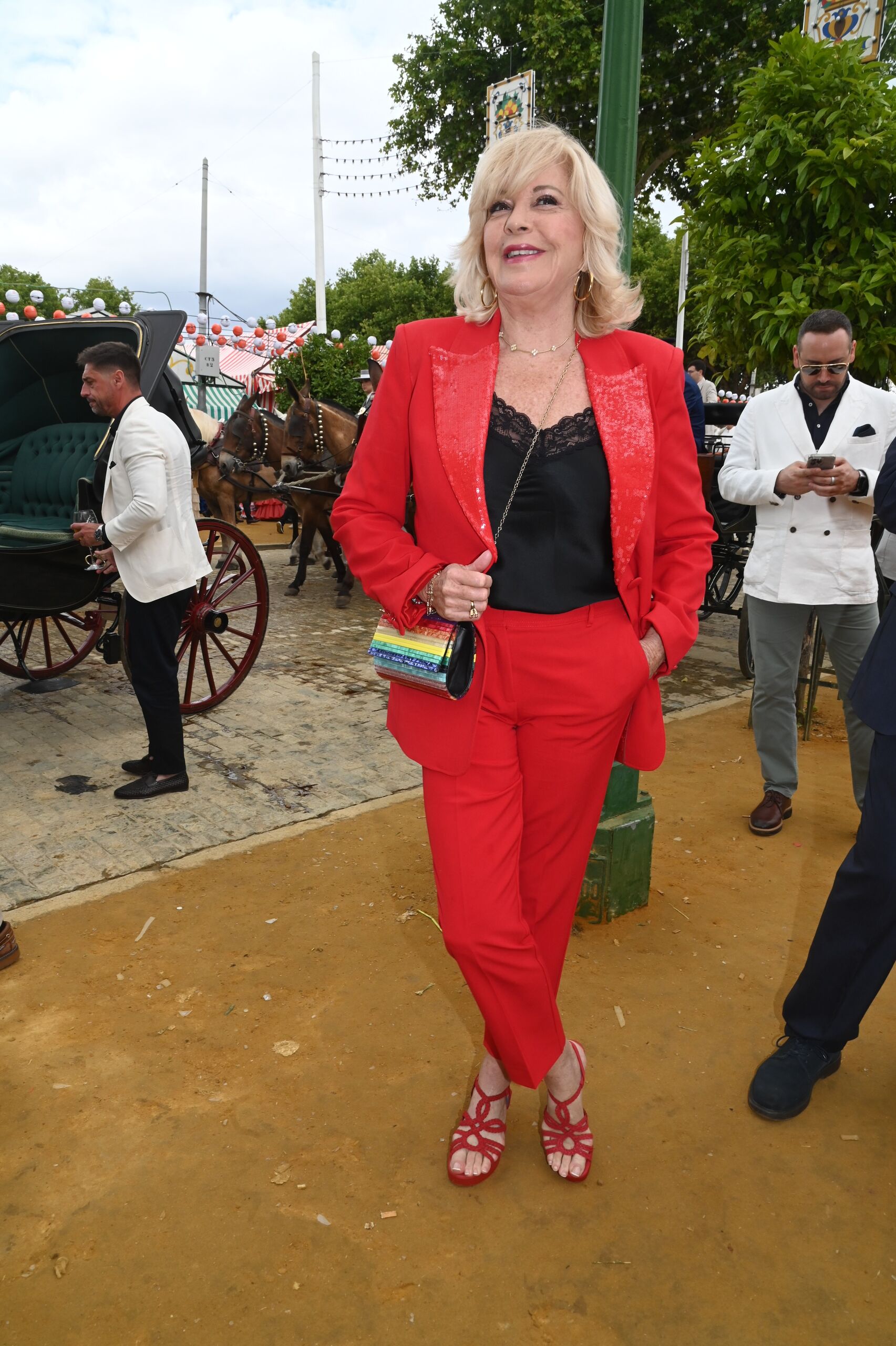 Bárbara Rey, con traje de chaqueta rojo adornado con lentejuelas, top negro lencero y sandalias también rojas.