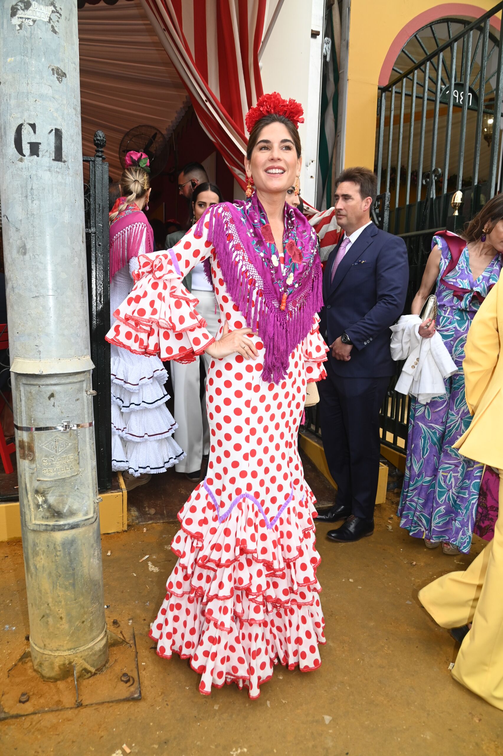 Lourdes Montes, muy sonriente y recuperada de su tercer embarazo, con un vestido de flamenca de lunares rojos.