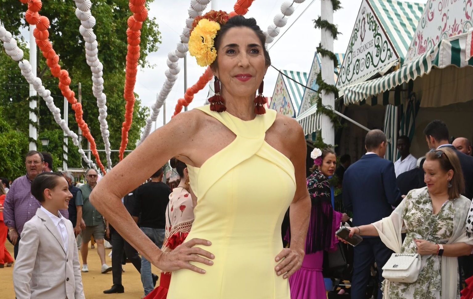Paz Padilla, gran amiga del empresario, con un vestido amarillo de cuello halter muy favorecedor.