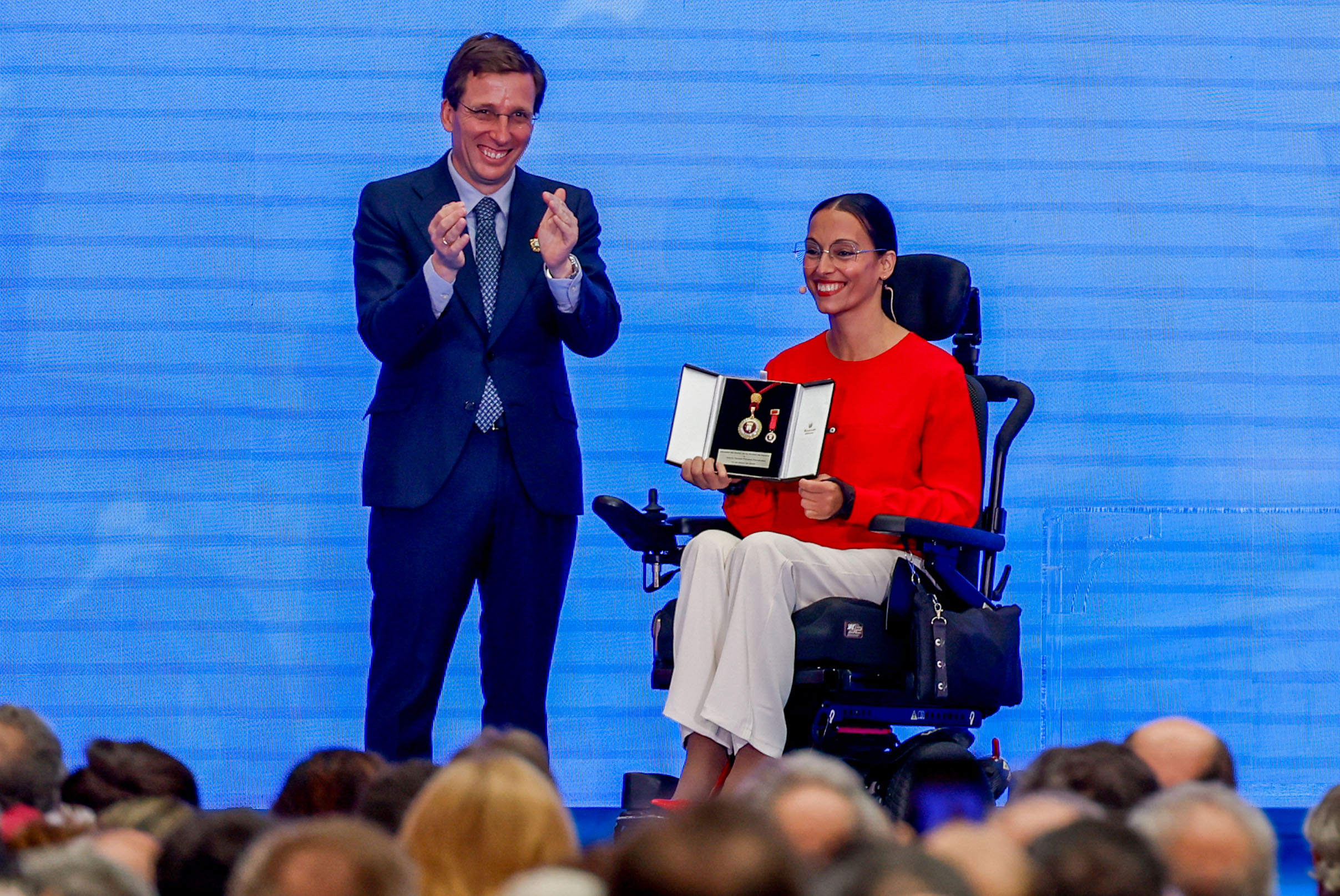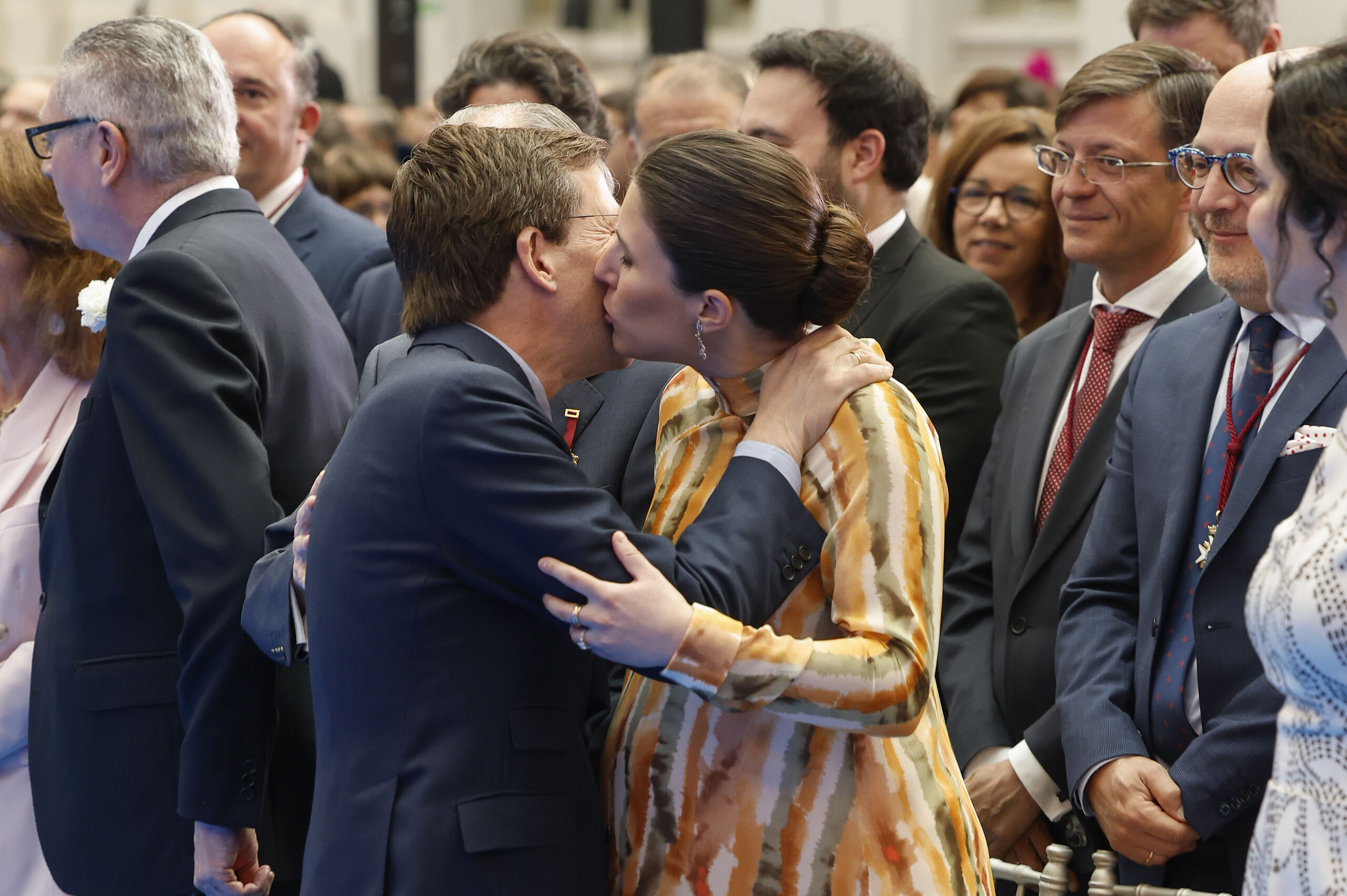 Teresa Urquijo, esposa del alcalde, que se ha estrenado en la entrega de las Medallas de la Ciudad de Madrid, ha saludado con un beso a su marido, José Luis Martínez-Almeida.