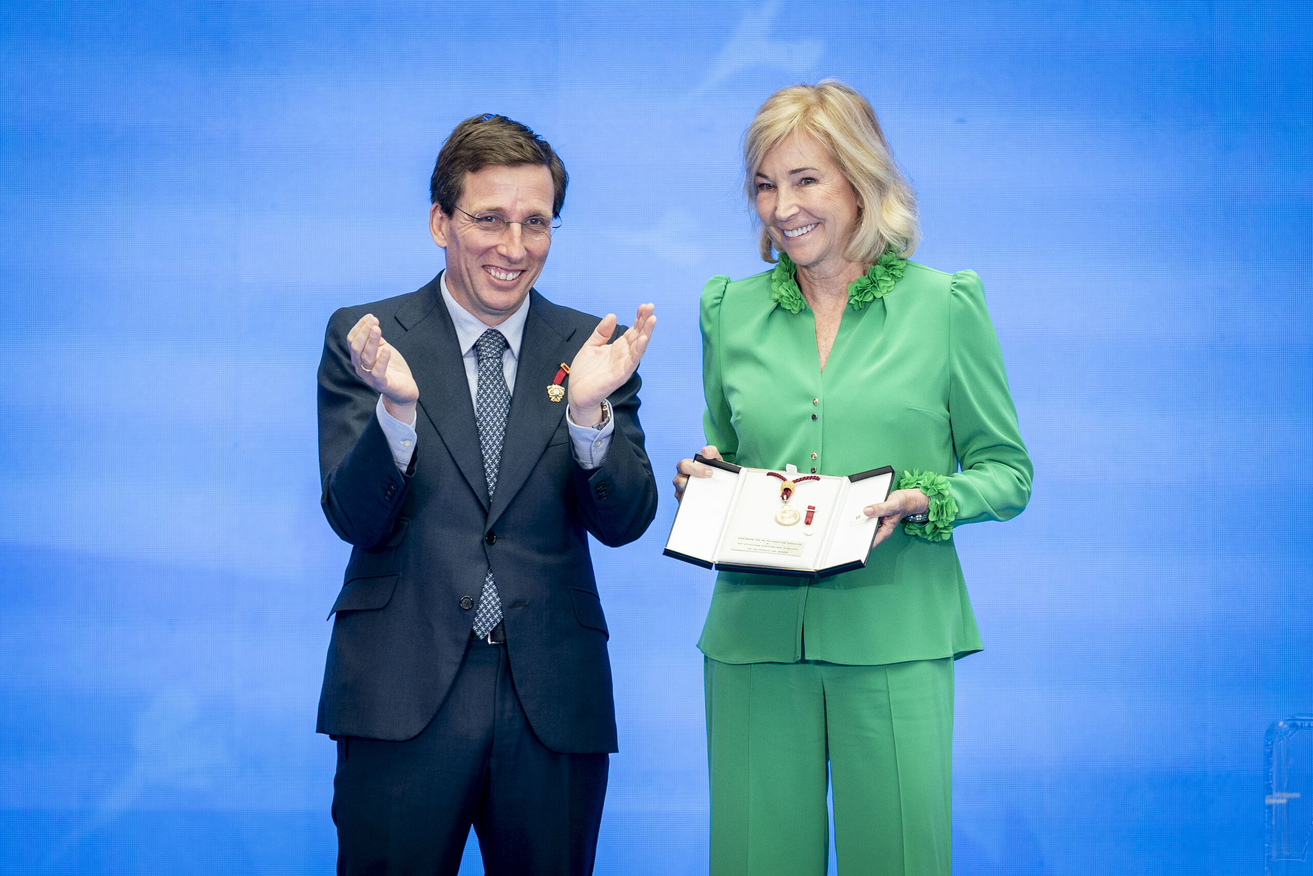 José Luis Martínez-Almeida entrega la distinción a la banquera María Dolores Dancausa, muy elegante con un conjunto de pantalón y camisa en verde, con flores en el cuello y los puños.