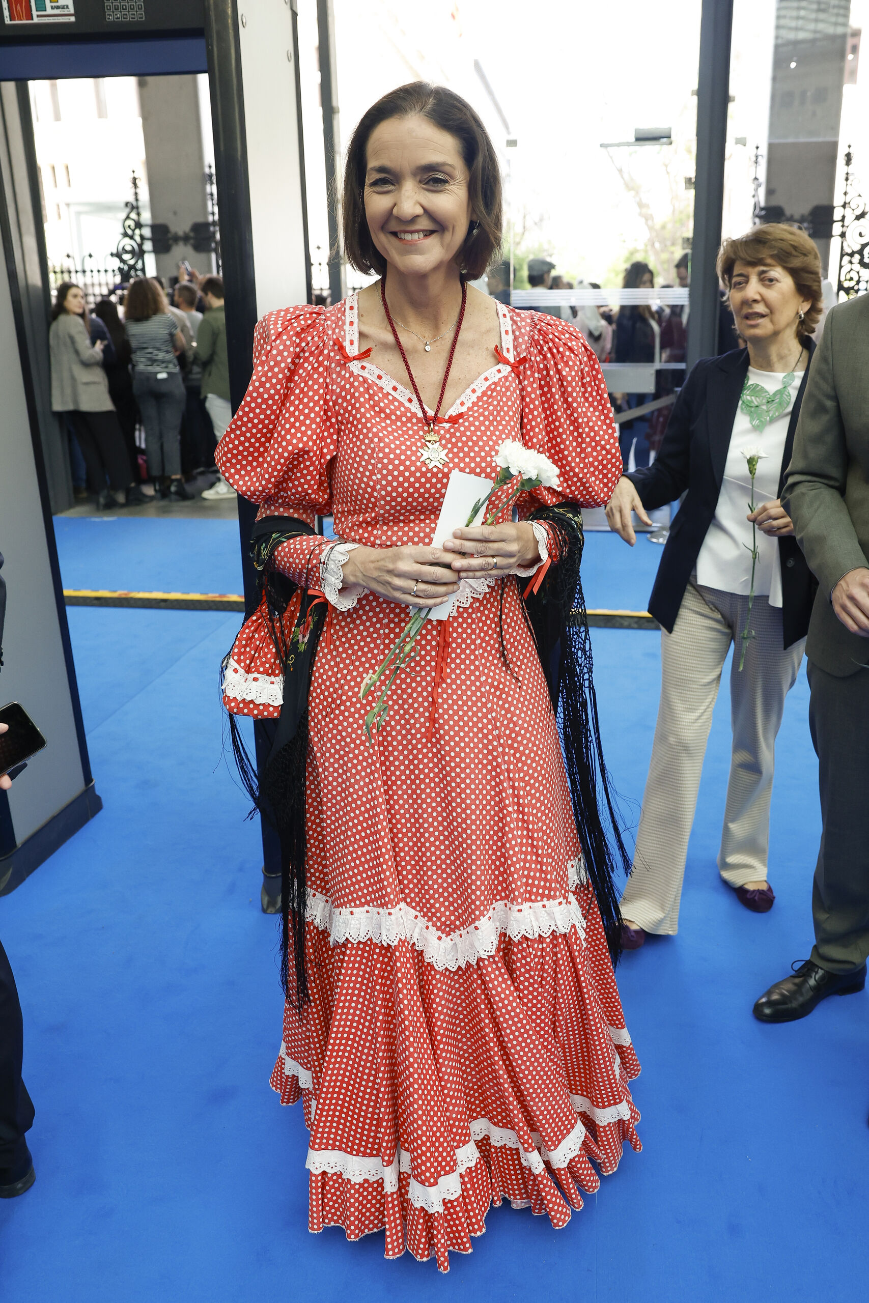 La portavoz del PSOE en el Ayuntamiento de Madrd, Reyes Maroto, se ha vstido de chulapa con vestido rojo con lunares blancos y mantón negro, sin pañuelo en la cabeza.