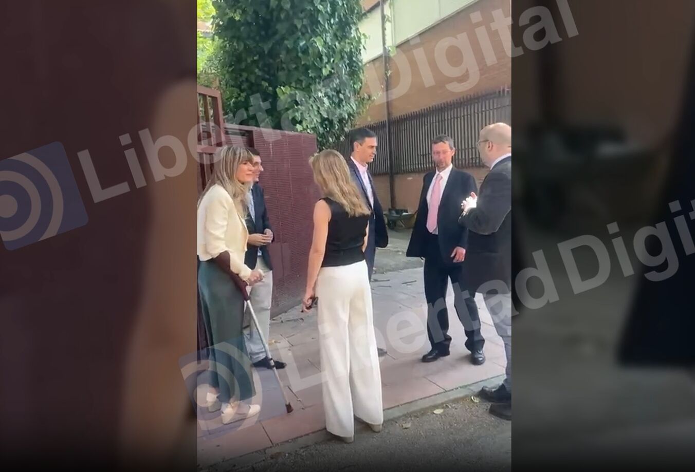 En la grabación, vemos a Begoña Gómez saludando a los responsables del Instituto Ciudad de los Poetas, un centro público ubicado en el Barrio de Saconia, en el distrito de Moncloa-Aravaca, en Madrid. Según testigos presenciales, tanto el presidente como su esposa se comportaron como dos padres más y aunque su presencia no pasó inadvertida, sí hicieron lo posible por no destacar. Llama la atención que Begoña, que viste un vestido de satén verde y una chaqueta corta de color beige, se ayuda para caminar de unas muletas, aunque desconocemos la dolencia que la aqueja y que podría haberla mantenido alejada del foco durante todo este tiempo. Sorprende que calce unas alpargatas de cuña (con tacón) lo que hace sospechar que sería una dolencia.