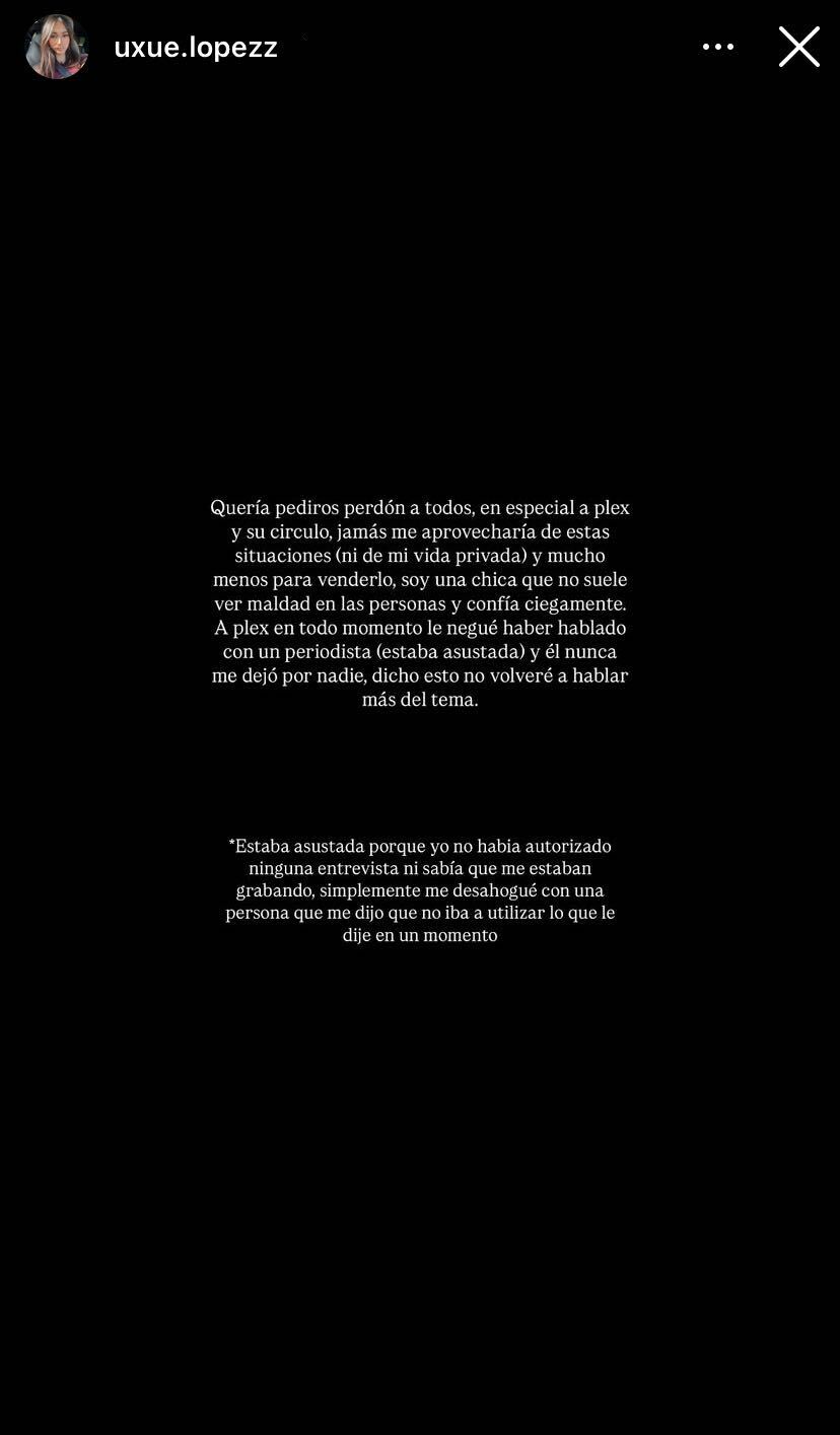 Ahora es la propia Uxue la que a través de otro comunicado se retracta de sus palabras y confirma la conversación con el periodista, además pide perdón a todos y en especial a Plex por lo sucedido: "Quería pediros perdón a todos, en especial a Plex y a su cículo, jamás me aprovecharía de una situación así, ni de mi vida privada, y mucho menos con intención de vender nada".