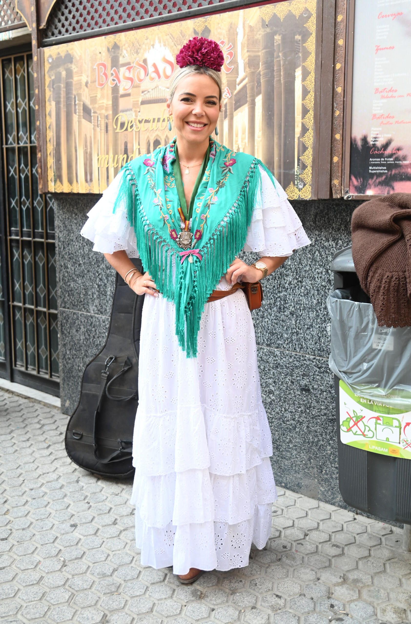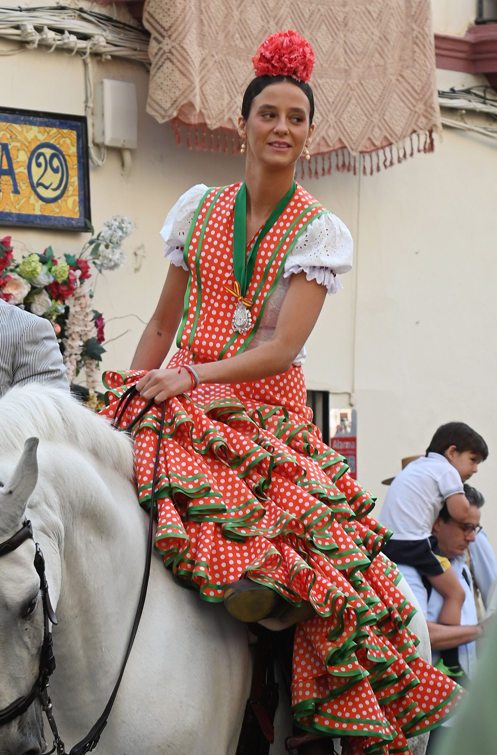 Siendo el protocolo rociero, la hija de la infante Elena ha acudido ataviada con una bata de camino, formada por una vistosa falda de volantes en color rojo, con lunares blancos y ribetes en verde. A juego un cuerpo con el mismo estilo, y sobre él, la medalla de la hermandad. En su cabeza ha lucido un clavel también en color rojo que lucía sobre un sencillo recogido, dejando el cabello en un cómodo moño bajo, perfecto para cabalgar bajo el sol.
