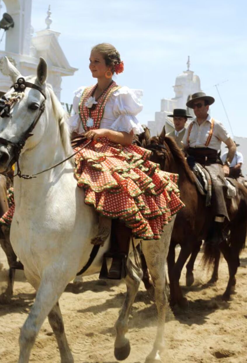 Se trata de un vestido homenaje a su madre, pues la infanta Elena ya lo lució hace cuarenta años, en la romería del año 1984. Aquel año, la entonces reina Sofía acudió acompañada de sus hijas, las infantas, e iniciaron el trayecto junto a la misma hermandad con la que ha partido Victoria Federica. Incluso el caballo recuerda al que montó su madre.