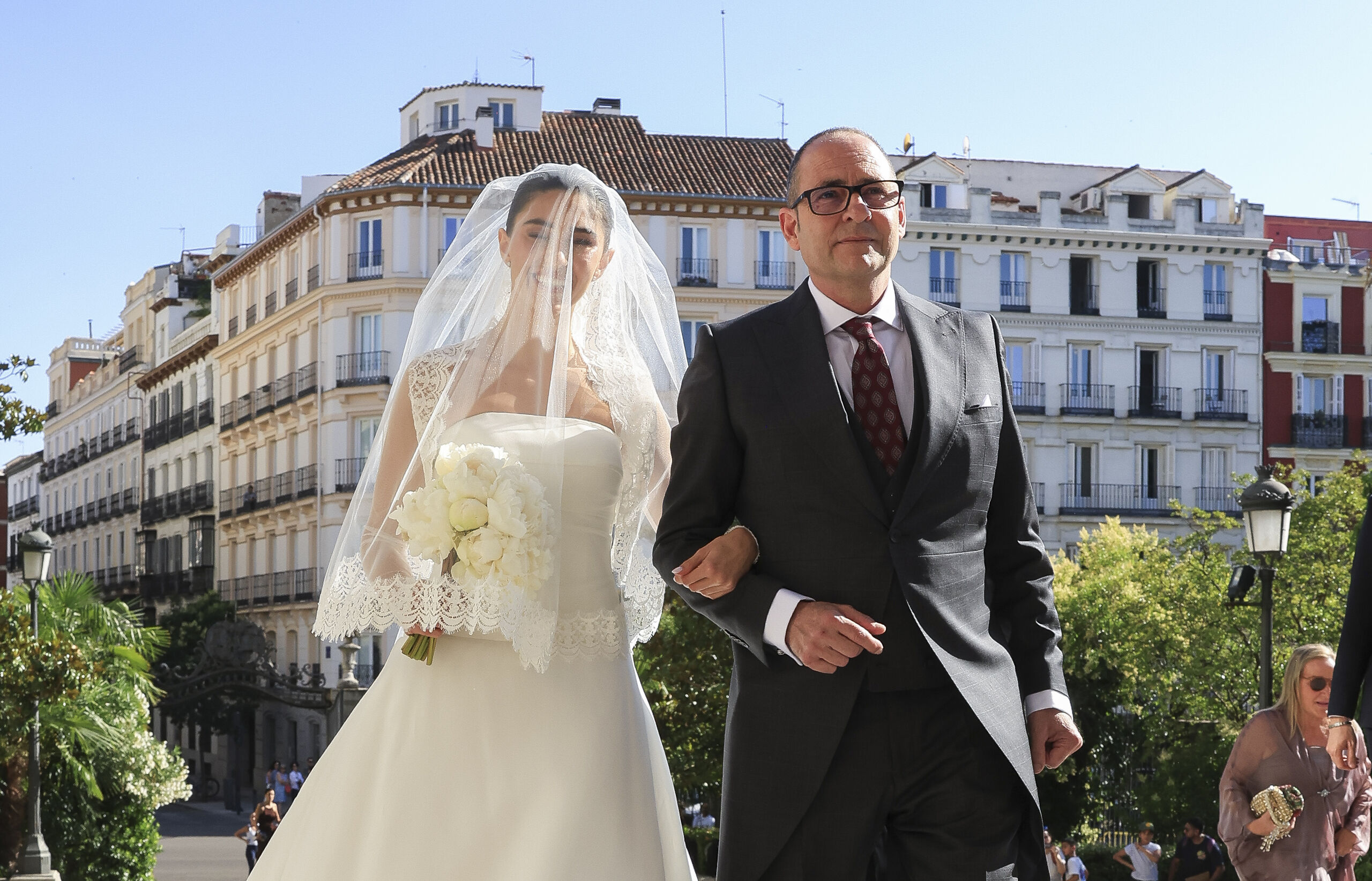 La ceremonia, que ha tenido lugar en la iglesia de Santa Bárbara ha acogido un enlace cargado de emotividad donde ha destacado, como es lo normal en una boda, el vestido de la novia. Un diseño elegante y sencillo de la firma Rosa Clará. En la foto, el momento de la llegada de la novia.