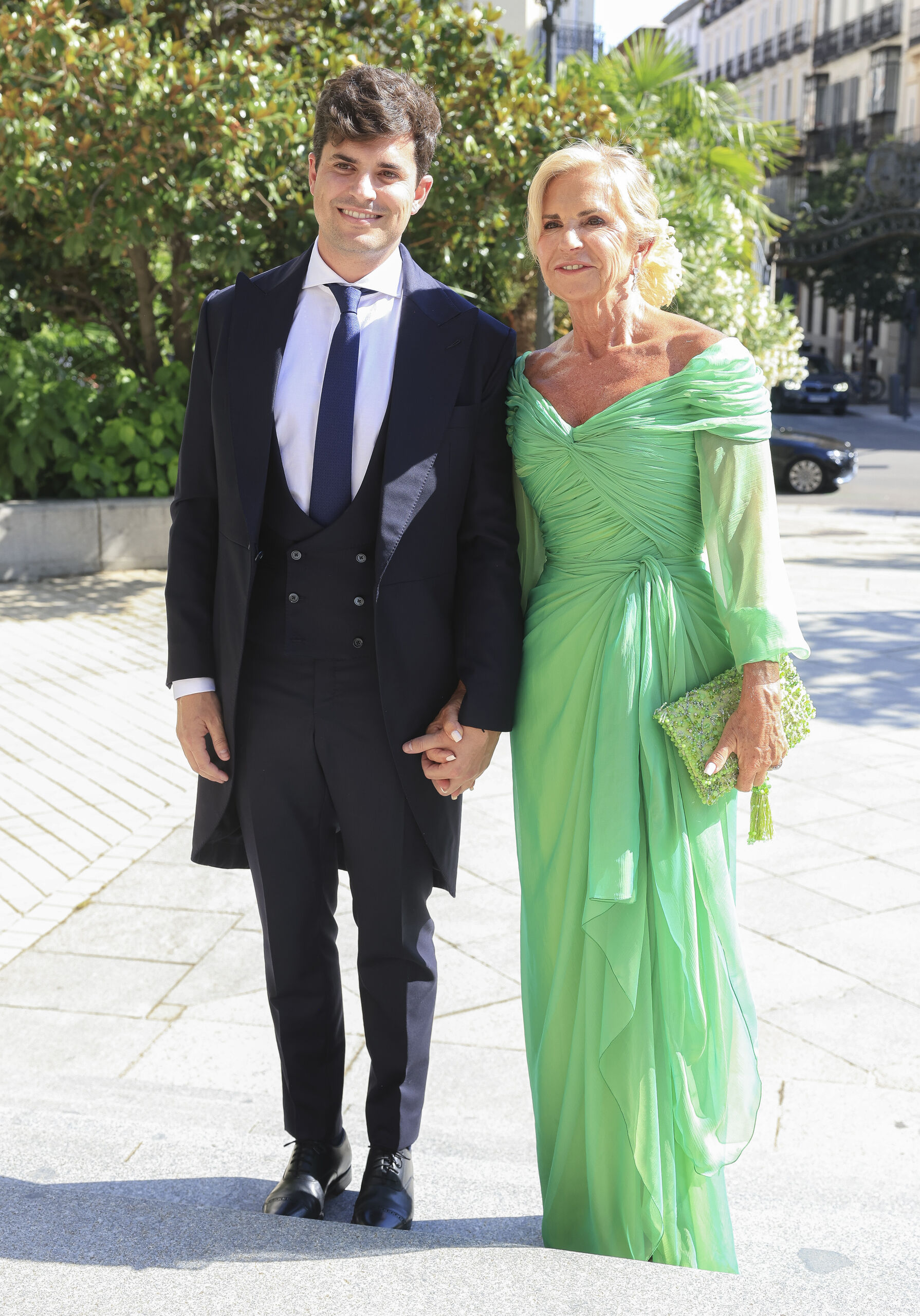 El novio ha optado por el clásico chaqué en azul marino de la firma Absoloute Bespoke, con chaleco y una corbata en un tono azul marino algo más claro. Su madre Merche Luengo, la madrina, ha elegido un veraniego vestido en color verde lima, mangas drapeadas y con un escote estilo bardot.