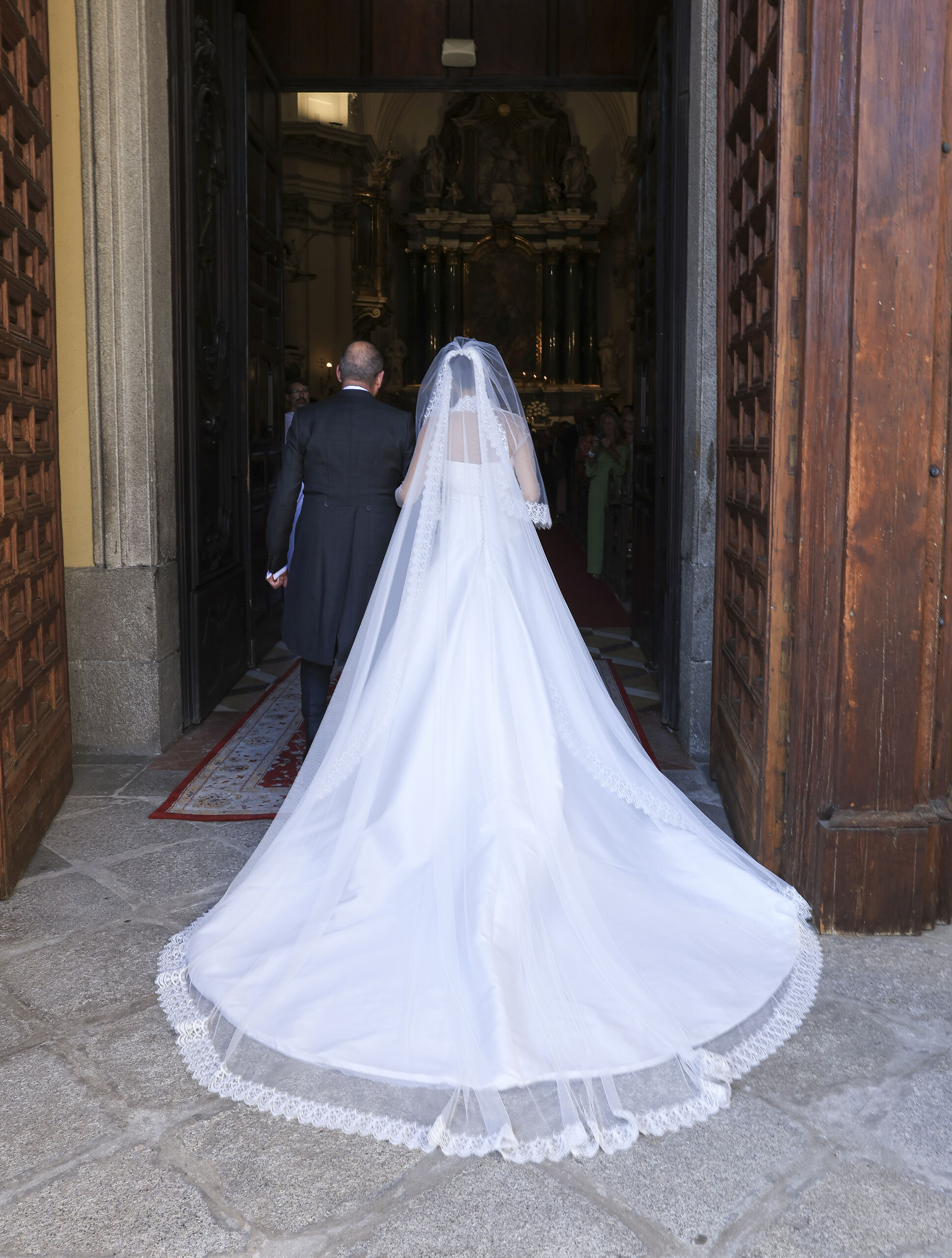 Se trata de un vestido de corte clásico, con escote palabra de honor y cuerpo semirígido con falda campana. Dentro del templo, ha cubierto sus hombros con una chaqueta de tul, adornada con bordados de encaje a juego con el velo, que siguiendo la tradición, cubría su rostro. En la imagen se puede apreciar los detalles del vestido por detrás.