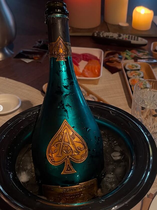 Para celebrar un día tan especial la pareja disfrutó de una comida a domicilio, tal y como podemos ver en una de las imágenes que ha compartido el exdeportista. En ella se puede ver sushi, la típica comida japonesa, y una botella de cava de la exclusiva marca Armand de Brignac cuyo precio ronda los 400 euros por botella.