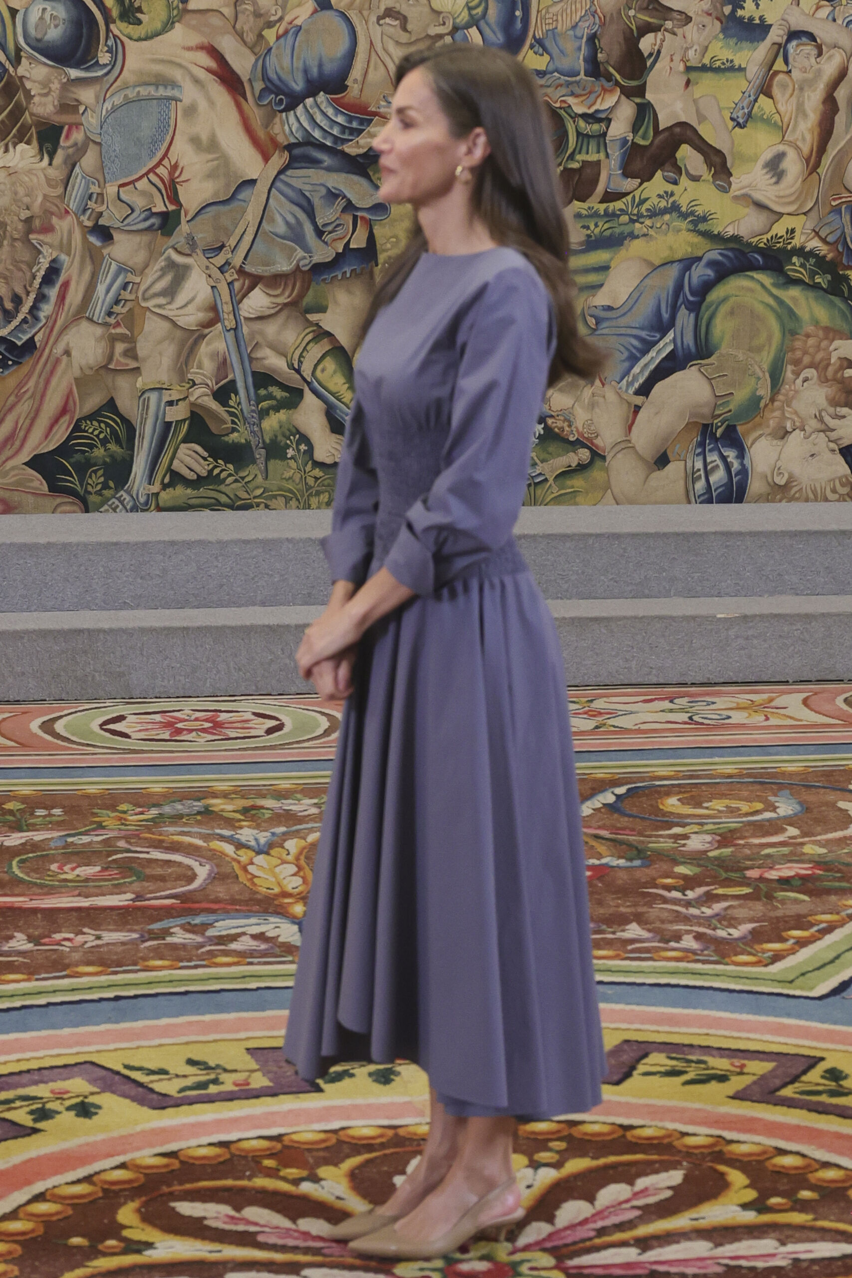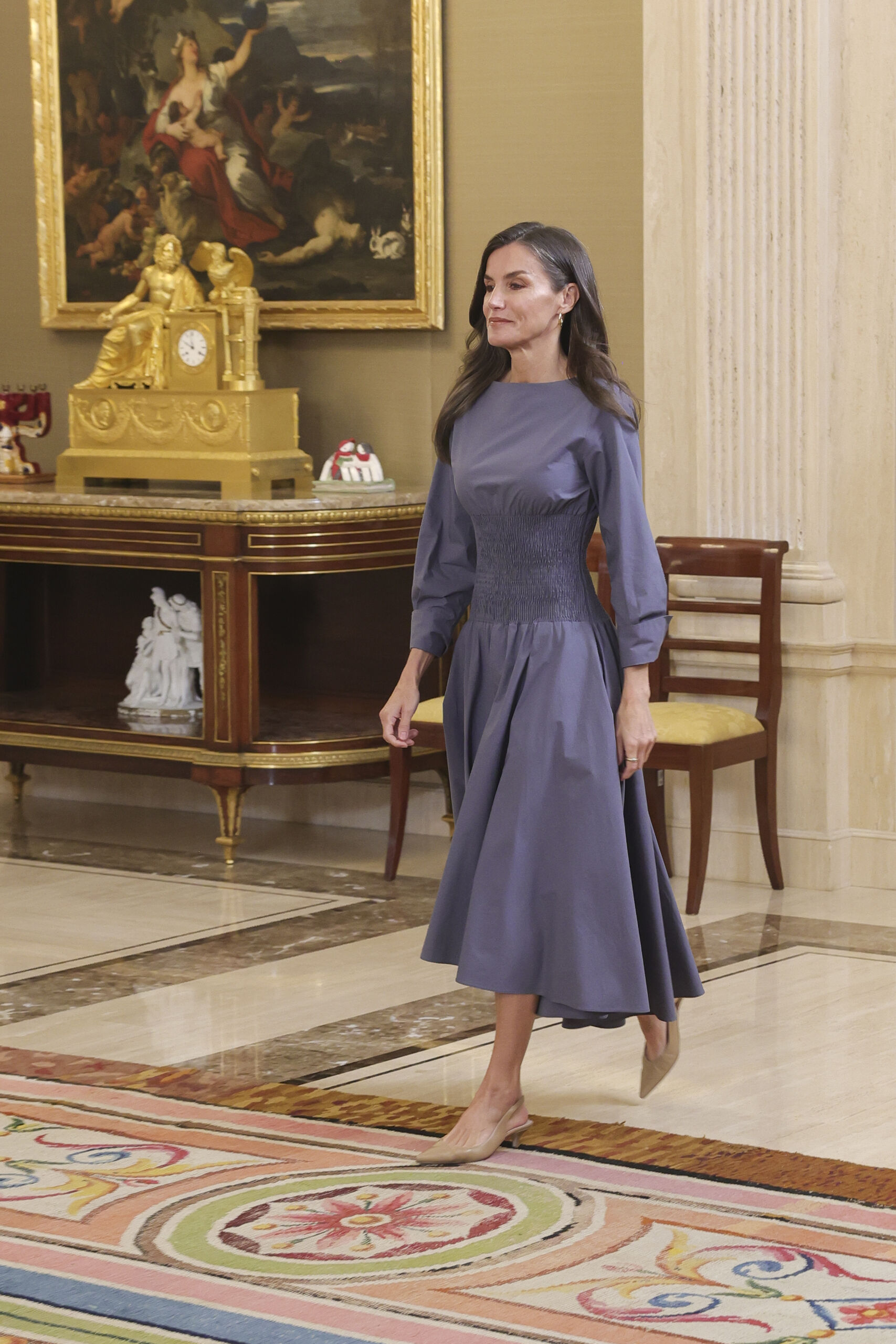 Se trata de un vestido de Adolfo Domínguez en color gris azulado, de largo midi, bajo asimétrico de vuelo y manga francesa ligeramente abullonada y escote redondo cerrado, que destaca por un patrón fruncido de 'nido de abeja' desde debajo del pecho hasta la altura de la cadera, realzando al máximo la silueta de Doña Letizia.