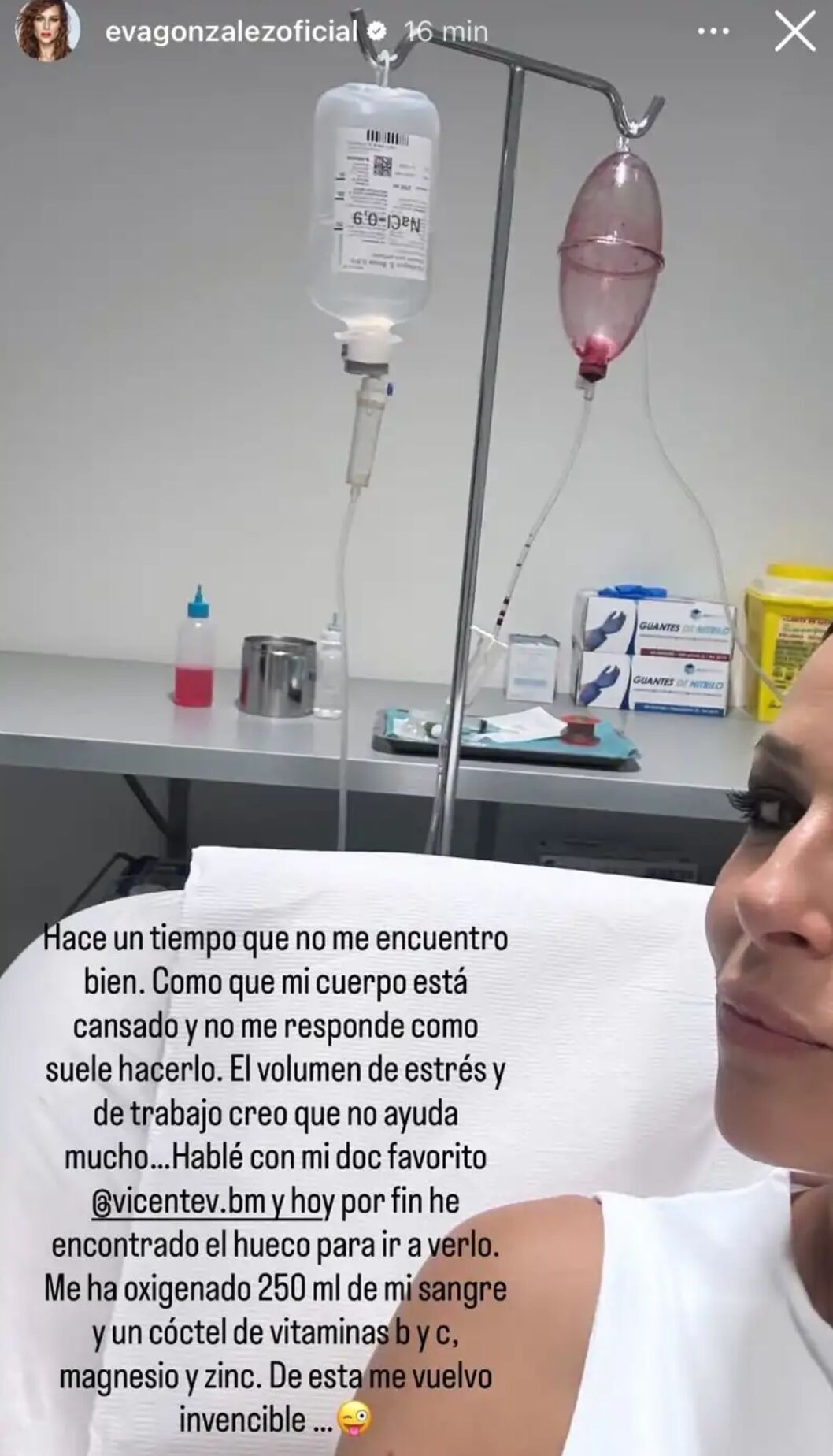 Para poner solución a esta situación, la presentadora de Antena 3 ha visitado a unos de sus médicos de confianza: "Hoy por fin he encontrado el hueco para ir a verlo. Me ha oxigenado 250 ml de mi sangre y un cóctel de vitaminas b y c, magnesio y zinc. De esta me vuelvo invencible", ha explicado sobre el tratamiento junto a la imagen en la que se ve a Eva González con rostro serio y mostrando el suero y el cóctel de vitaminas al que hace referencia.