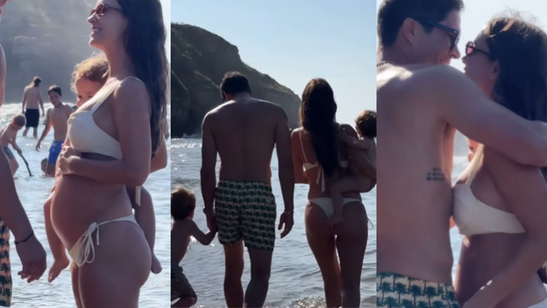 En las imágenes se ve a la familia Castellano Pombo en la playa, entrando al mar de espaldas. Pablo de la mano de Martín (4) y María sostiene la pequeña Vega (2). Cuando la influ se gira para mirar a su marido se aprecia la pequeña barriga y la toca con amor. Entre risas el primogénito de la familia les echa agua.