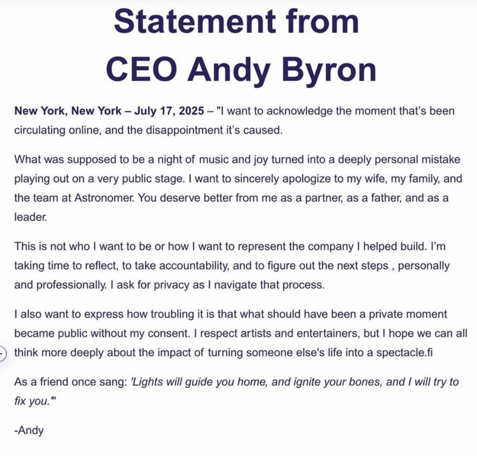 "Quiero reconocer el momento que está circulando en las redes y la decepción que ha causado. Lo se suponía iba a ser una noche de música y diversión se ha convertido en un profundo error que ha tenido lugar en un espacio público", empieza diciendo este presunto comunicado, para seguir con las disculpas. "Quiero pedir perdón sincero a mi mujer, mi familia y al equipo de Astronomer. Merecías más de mí como pareja, como padre y como líder". "Esto no es lo que quiero ser ni representar a la empresa que ayudé a construir. Me tomo un tiempo para reflexionar, aceptar las consecuencias y pensar cuáles serán mis próximos pasos, personal y profesionalmente. Pido privacidad para poder afrontar ese proceso".