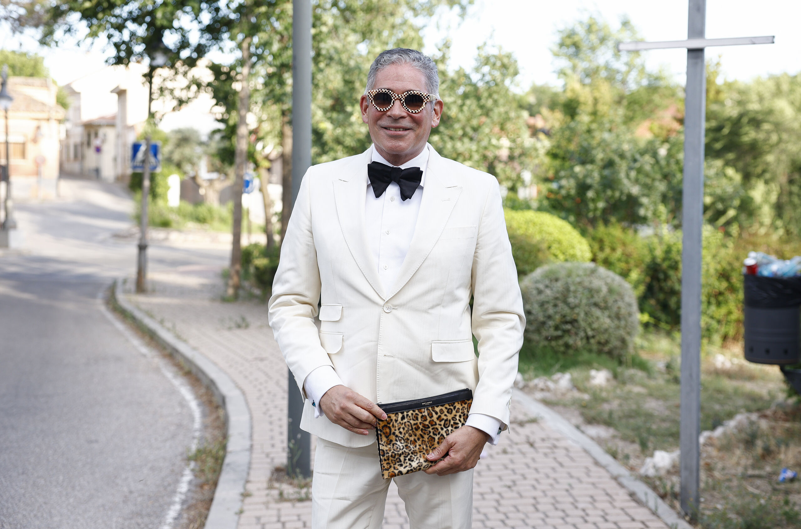 Derrochando elegancia, los novios eligieron un esmoquin de chaqueta blanca con solapas de pico y pajarita a juego, y pantalones negros. Un perfecto estilismo que combinaron con unos mocasines de charol.