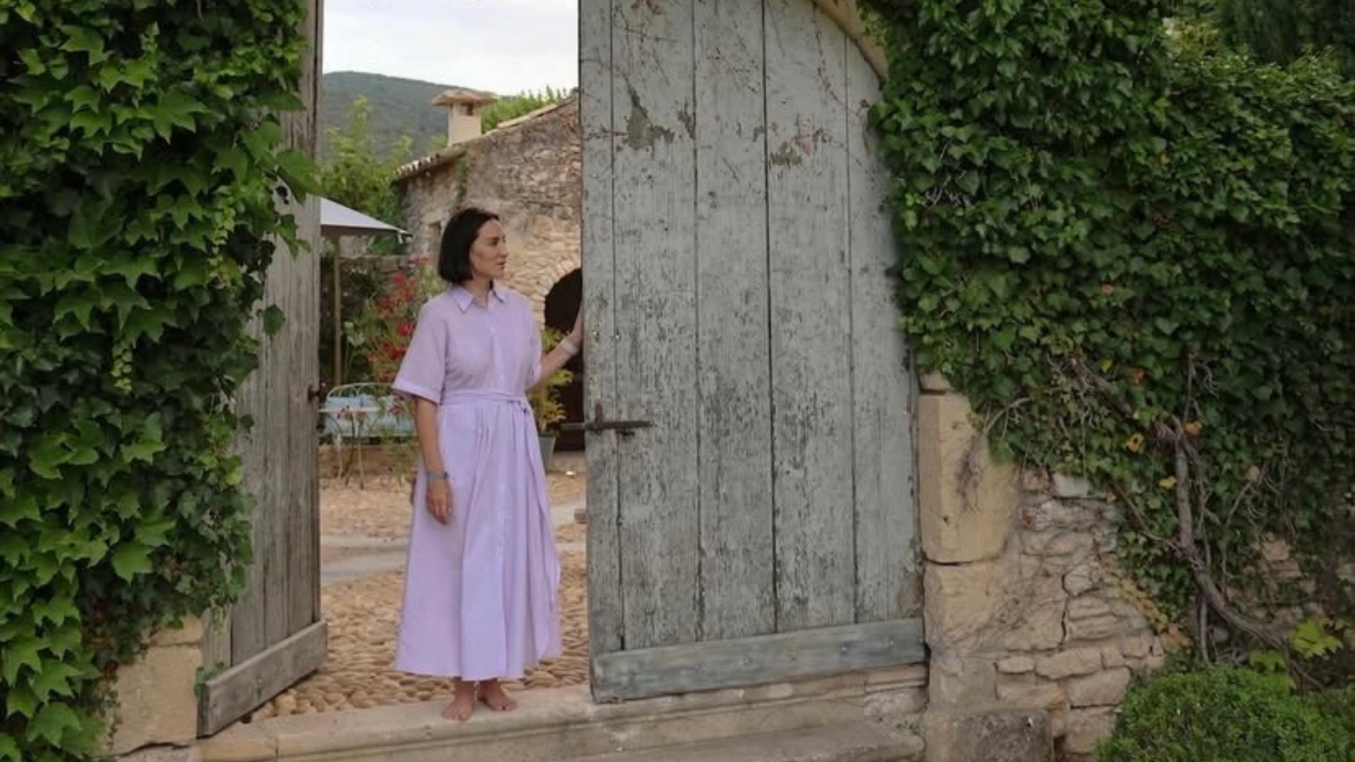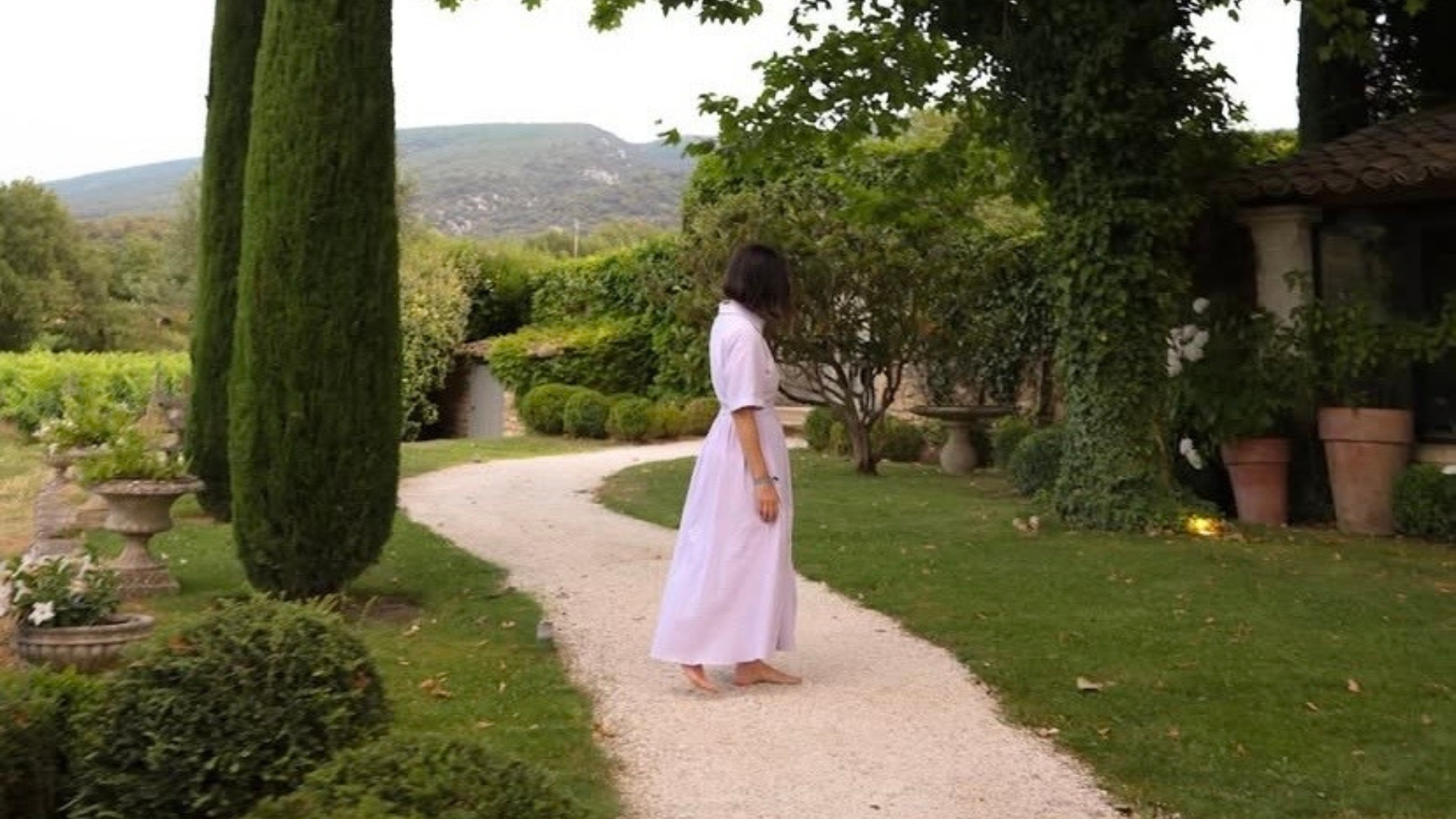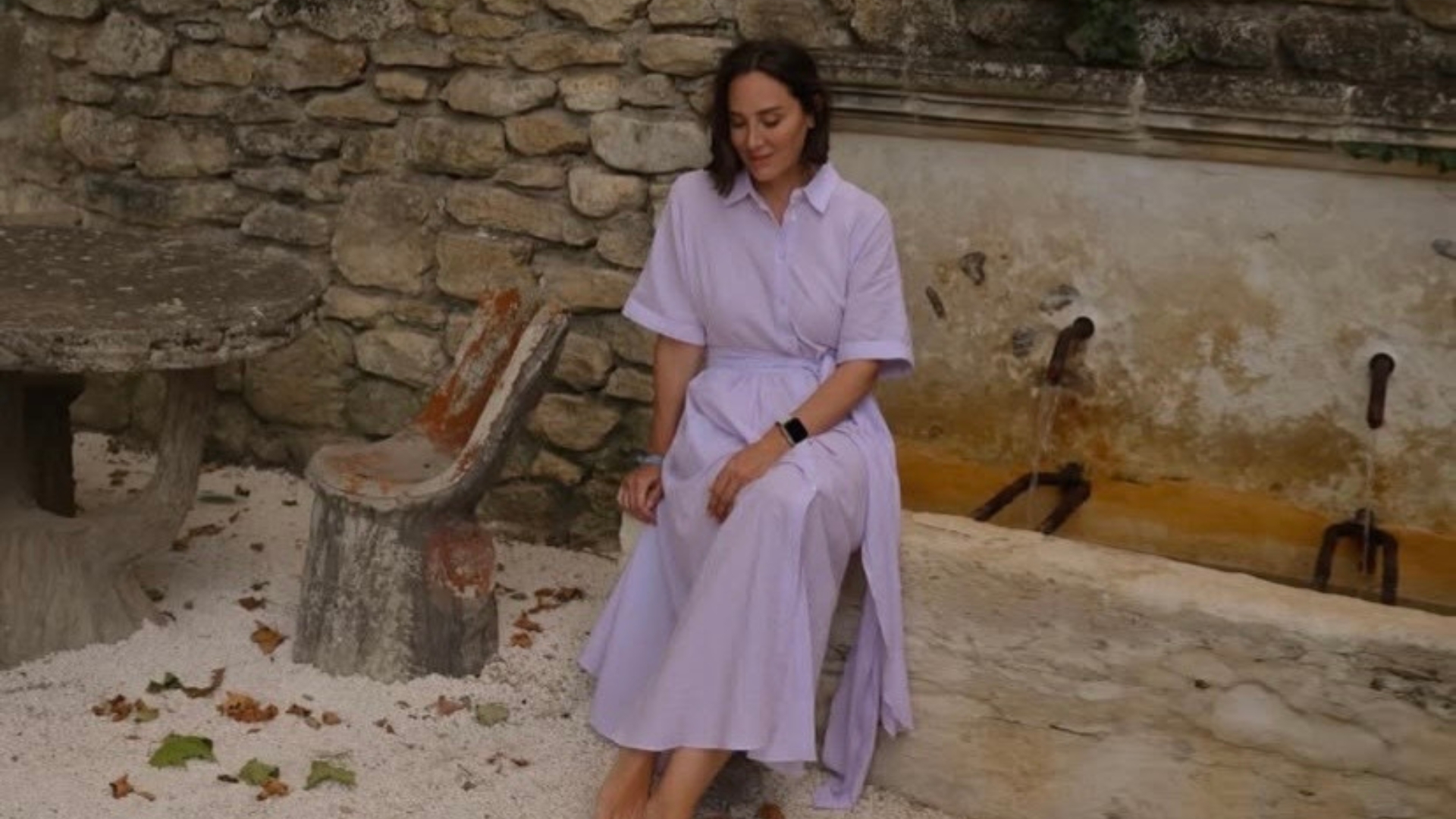 Para estas primeras fotografías, Tamara ha optado por un vestido camisero de lino violeta, con un pequeño cinturón que remarca la cintura. El vestido pertenece a su colección TFP by Tamara Falcó para Pedro del Hierro, y combina a la perfección con la esencia que quiere trasmitir en las fotografías.