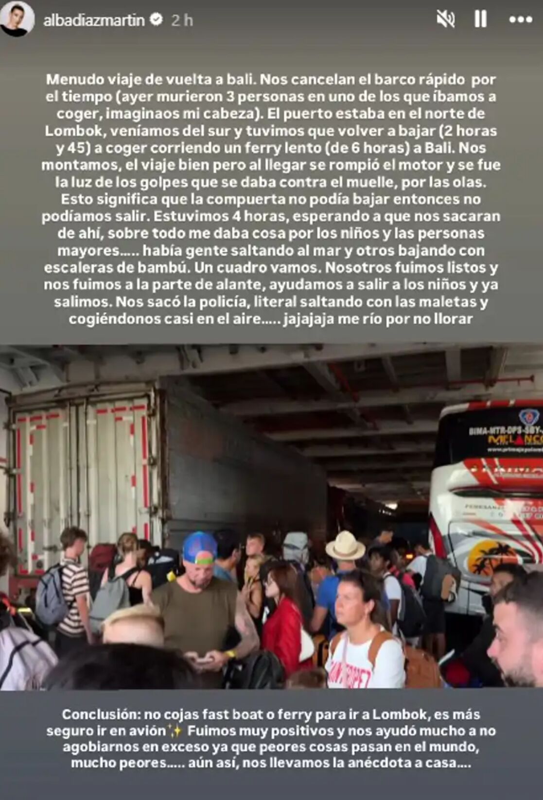 En sus stories de Instagram, Alba ha relatado la odisea que ha vivido con su pareja para poder regresar a la isla de Bali después de realizar una actividad turística por la zona de Lombok: "Menudo viaje de vuelta a Bali. Nos cancelan el barco rápido por el temporal (ayer murieron tres personas en uno de los que íbamos a coger. Imaginaros mi cabeza). El puerto estaba en el norte de Lombok, veníamos del sur y tuvimos que volver a bajar (2 horas y 45 minutos) a coger un ferry lento (6 horas) a Bali", ha contado.
