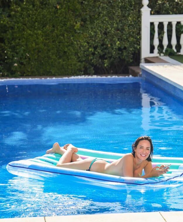 Recostada boca abajo sobre una colchoneta en la piscina y sin la parte superior del bikini, la marquesa de Griñón posó de manera natural y relajada, disfrutando de un momento de desconexión veraniega mientras consulta su teléfono.